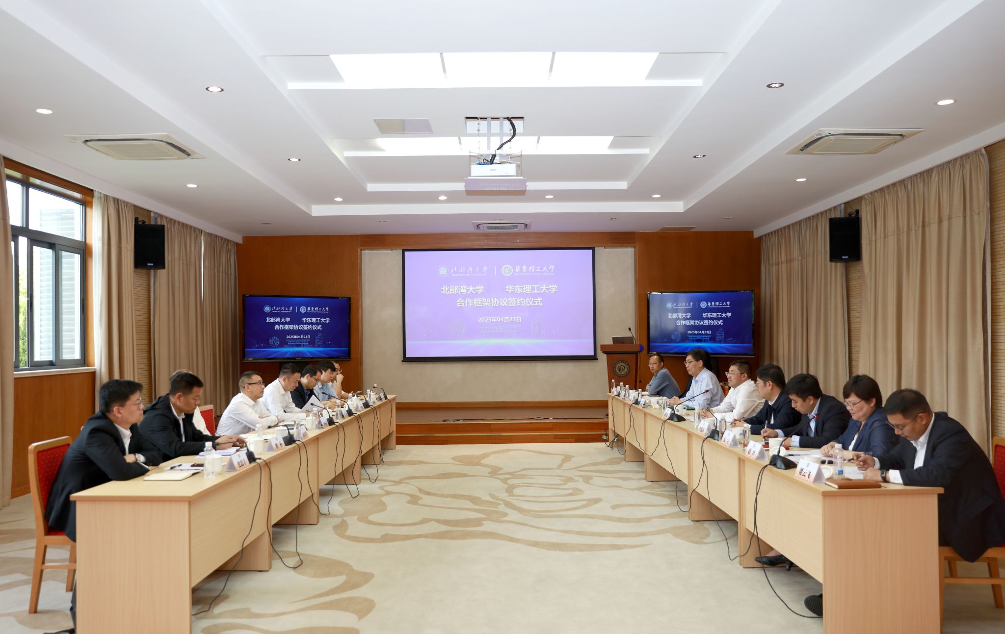 4月23日,学校由校党委书记徐华蕊,党委副书记、校长苗剑率队到华东理工大学调研交流并签署合作框架协议。华东理工大学党委书记蒋传海、副校长李春忠热情接待并见证签约。学校党委副书记唐高华与华东理工大学党委副书记沈海涛代表双方签署协议。学校副校长尹艳镇参加调研交流并见证签约。