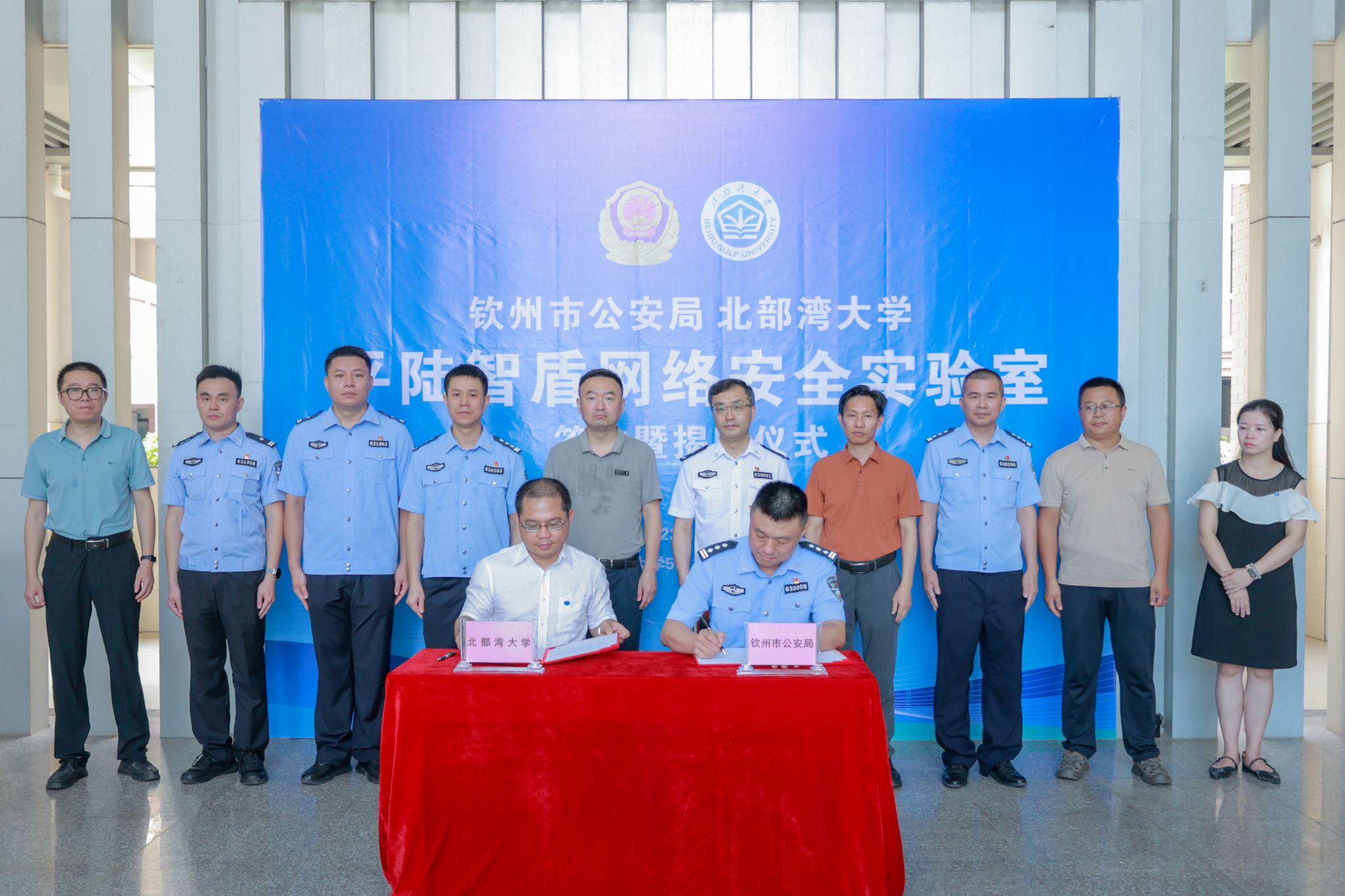 仪式现场,钦州市公安局党委委员、副局长林波和电子与信息工程学院党委书记邓安安代表双方签署合作协议。