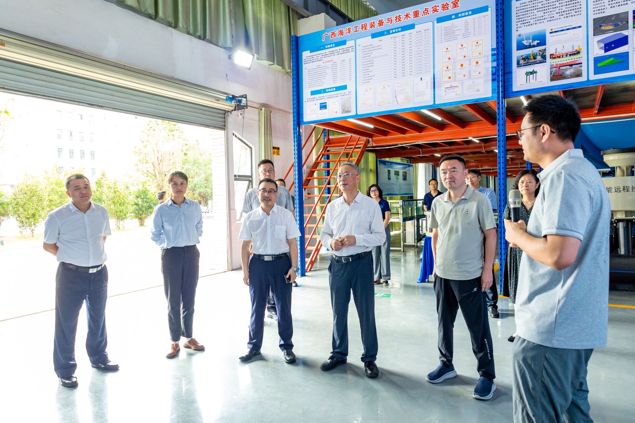 严新平一行在徐华蕊和苗剑的陪同下,考察调研了机械与船舶海洋工程学院船海水动力实验室及船海结构焊接智能化技术实验室,听取了北部湾台风、风暴潮与海浪预警预报系统关键技术及应用,红树林生态修复技术成果,以及涉海类学科教学、科研、人才培养和助力平陆运河建设等工作情况汇报。