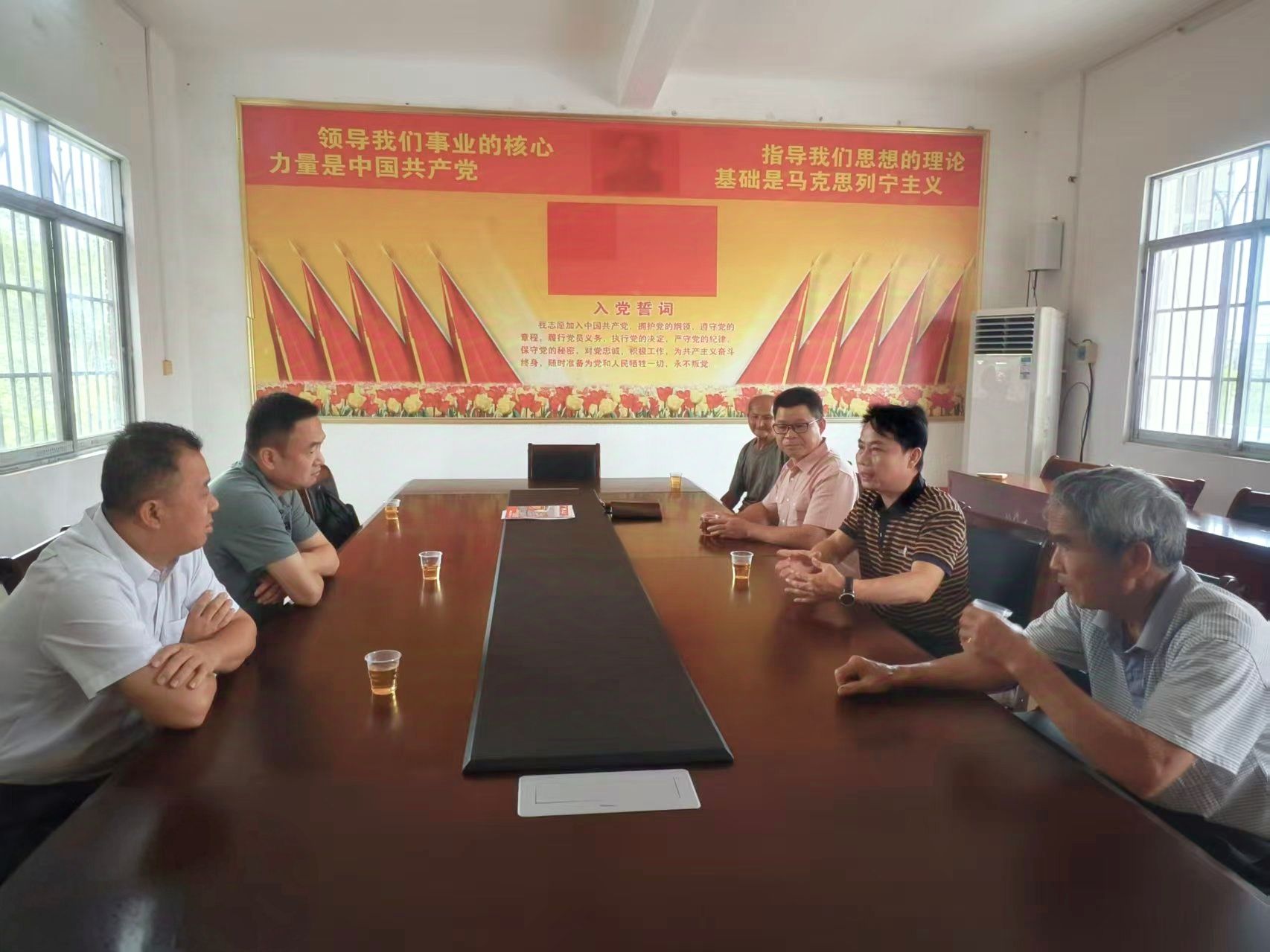 苗剑校长(左二)与帮扶对象在博白县东平镇富门村村委座谈