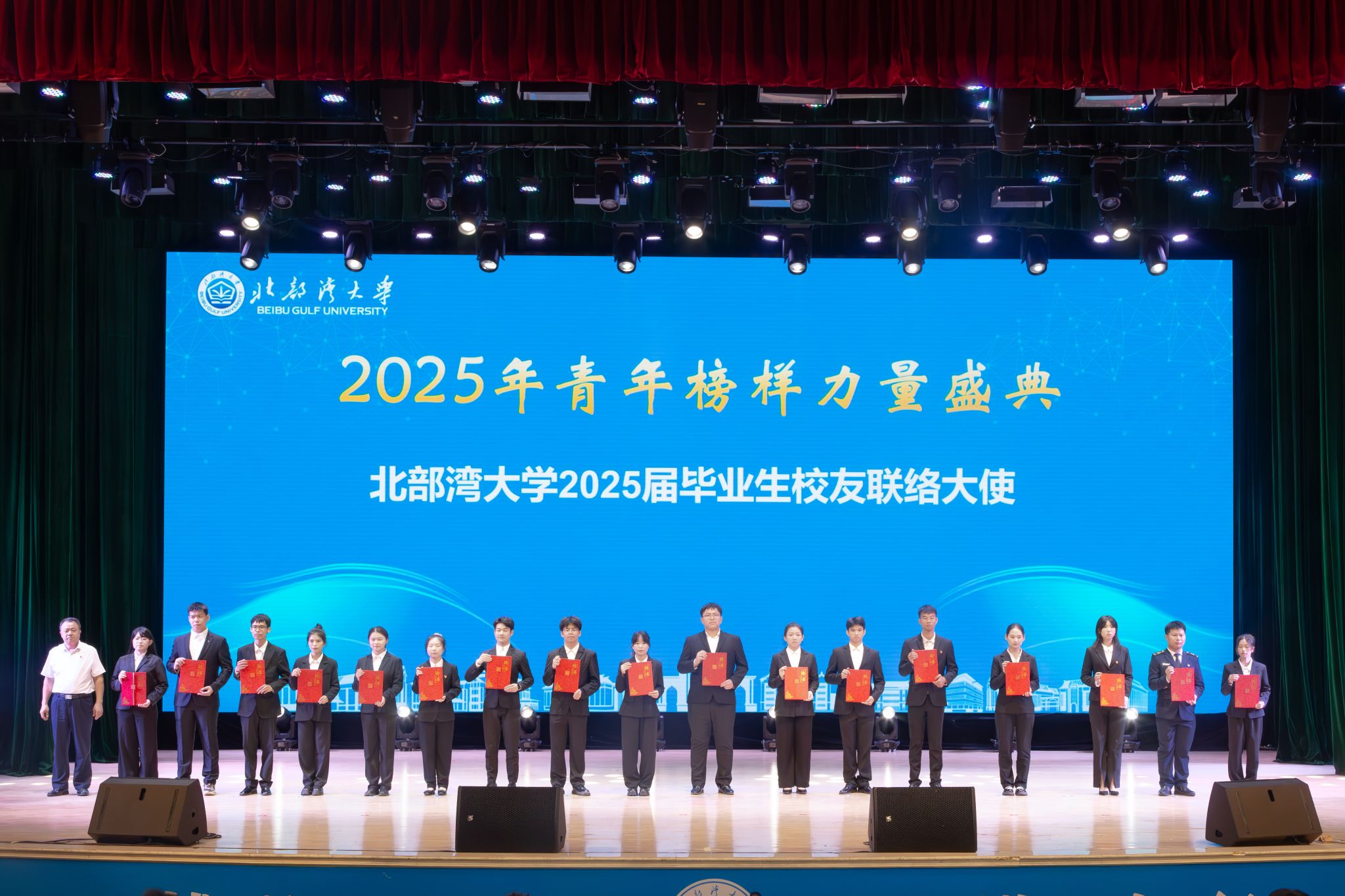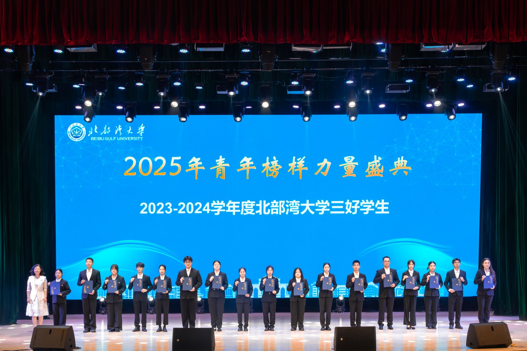 盛典在展现青春力量和向海图强精神的舞蹈《百川·入海》中拉开帷幕。在“励志勤学”篇章,苗剑、唐高华、梁智和马秀明分别为2023-2024学年度国家奖学金、国家励志奖学金,2024-2025学年度广西壮族自治区人民政府奖学金,2025年beat365平台官方网站校长奖学金的获得者颁奖。在“奉献向善”篇章,唐高华、梁智、马秀明、陈丹、闫松银分别为2024年度beat365平台官方网站“五四红旗团委”“五四红旗团支部”“优秀共青团干部”和2023-2024学年度beat365平台官方网站“先进班集体”“三好学生”“优秀学生干部”颁奖。在“奋勇争先”篇章,苗剑为国际及国家级竞赛获奖团队和个人颁奖。在“扬帆起航”篇章,唐高华为2025届广西普通高等教育优秀毕业生颁奖,梁智为2025年度大学生志愿服务西部计划志愿者佩戴绶带,陈丹为2025届beat365平台官方网站优秀毕业生颁奖,闫松银为2025届毕业生校友联络大使颁发聘书。