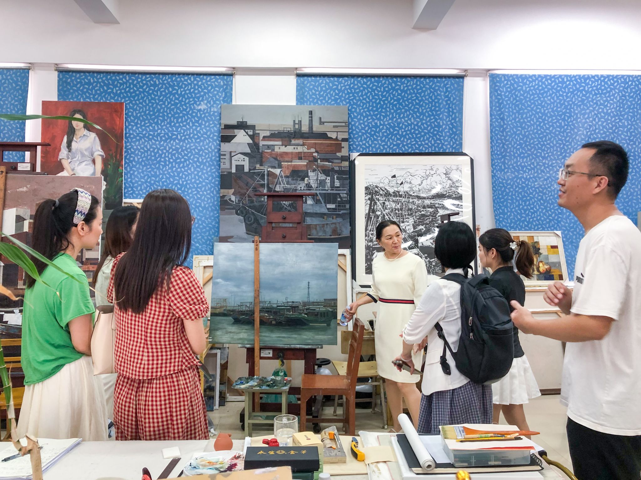 在陶瓷与设计学院海洋绘画工作室,教师们与师生探讨海洋艺术中的思政表达
