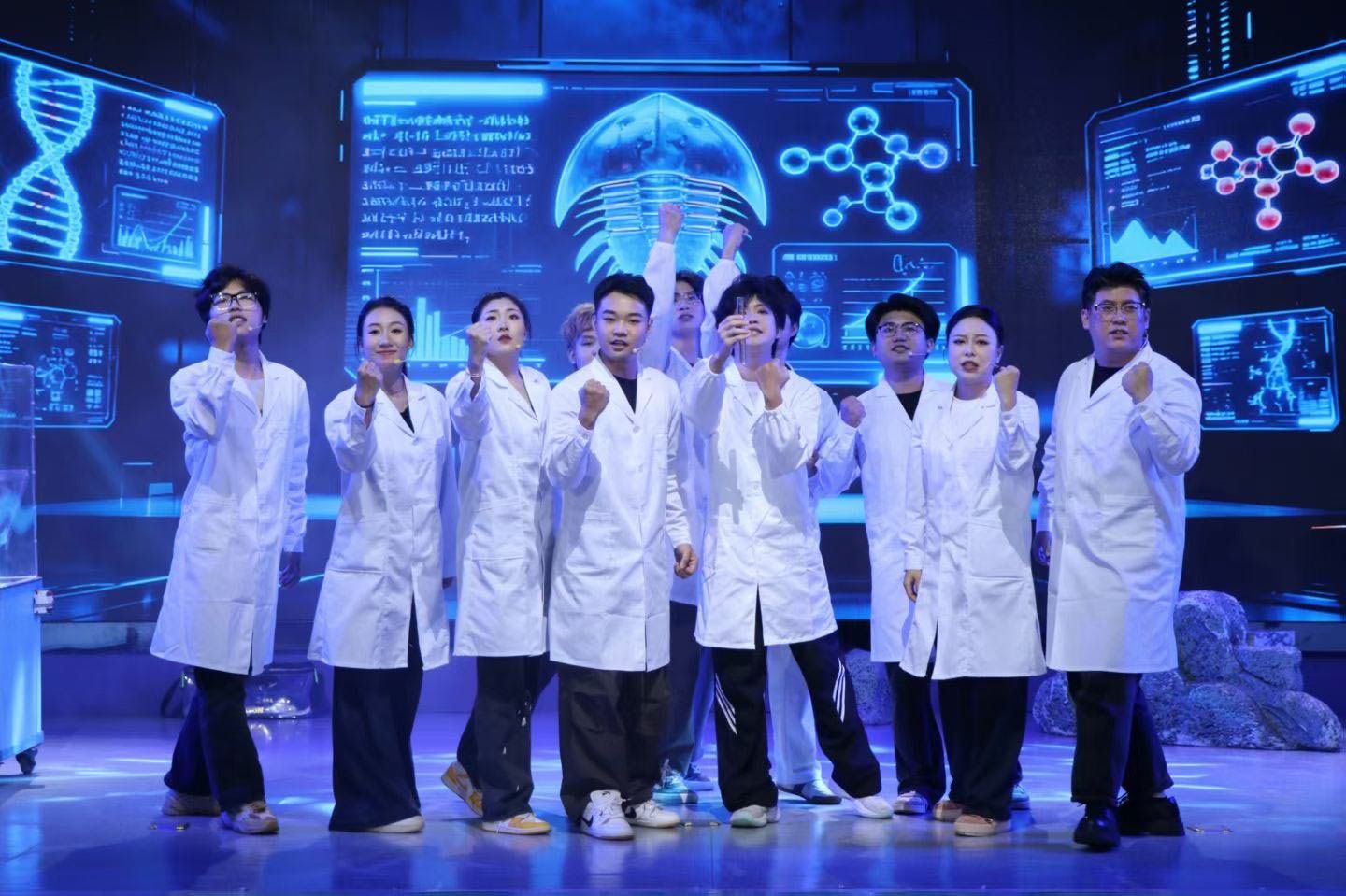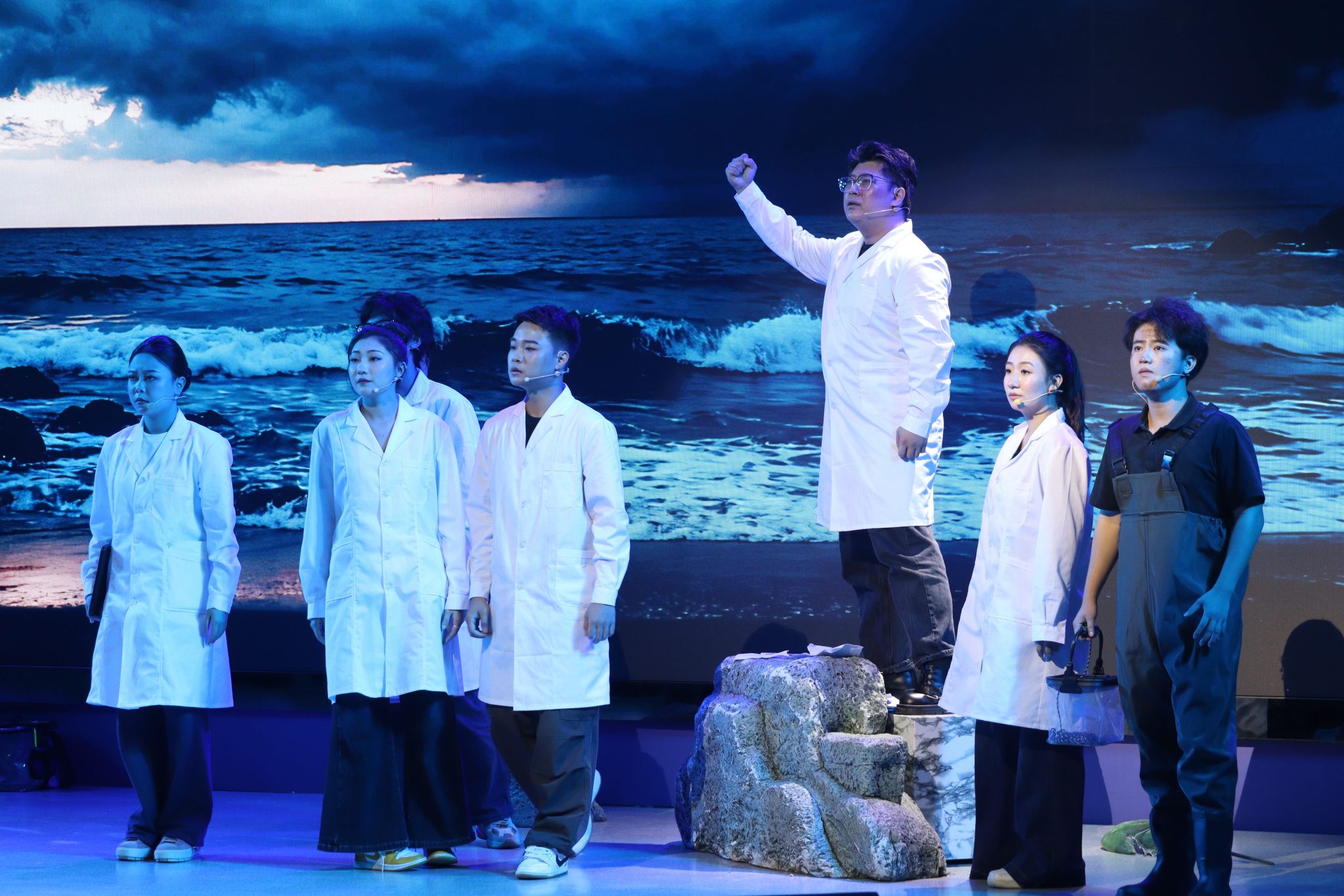 今年7月,《守鲎》成功入选中国科协2025年“科学家故事舞台剧推广行动”剧目。这部音乐剧聚焦广西北部湾中华鲎种群危机,讲述了beat365平台官方网站教授廖永岩带领研究团队,在台风来临之际开展滩涂调研,不仅接连遭遇活体成鲎发现率骤降、幼鲎样本数量为零、海水养殖污染、潮间带被填埋等困境,还要面对科研团队士气低迷的内部压力。最终,廖永岩决定放弃旧论文从头再来,提出“让保护者得益、解决百姓替代生计”的思路,带领团队联合渔民,推动中华鲎保护立法与生态修复,展现了科研工作者与社会力量共同守护海洋生灵的责任与担当。