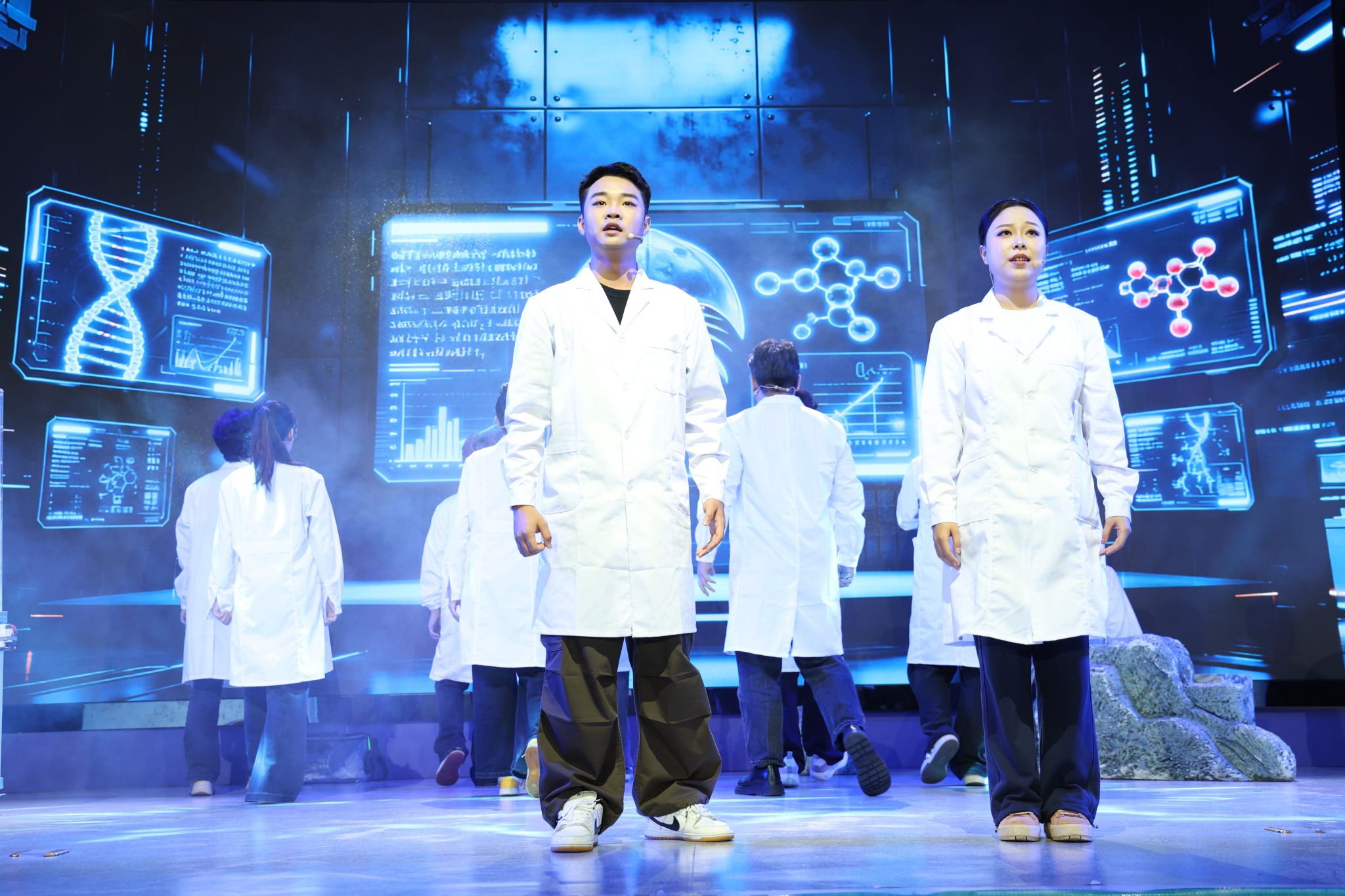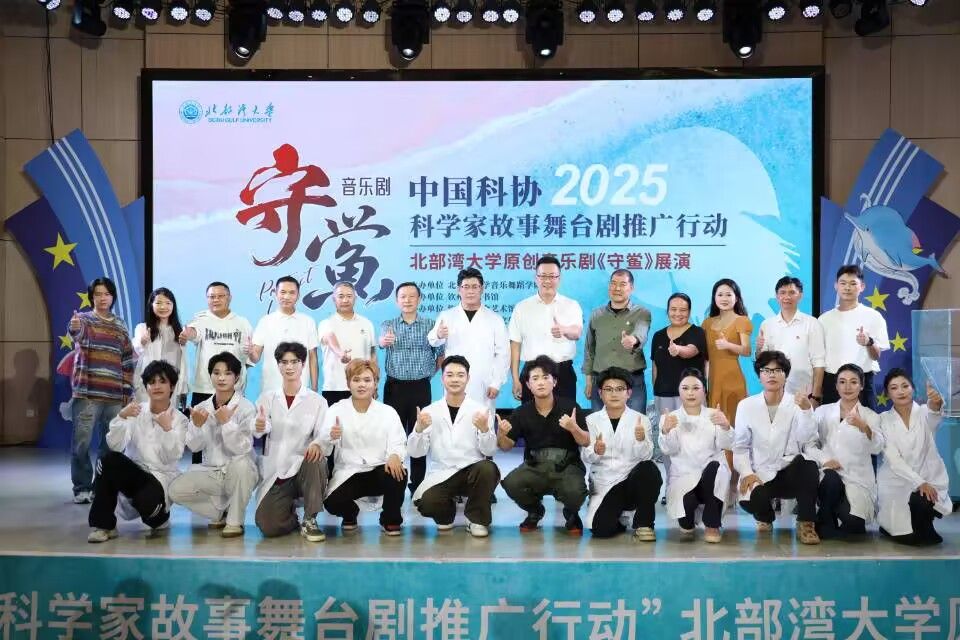 学校科技处副处长郭哲表示,学校围绕立德树人根本任务,将弘扬科学家精神与人文素养融入人才培养全过程,并依托科技人才与科技成果评价改革试点,建立健全科研创新激励机制和科教融汇机制,将音乐剧展演与科普服务纳入评价体系,鼓励教师探索“科学+艺术”融合路径。我们通过设立高水平成果培育基金、搭建跨学科协作平台、支持跨学院联合创作、组织开展公演等方式,推动艺术创作团队与科研团队深度对接,实现科学与艺术的双向赋能。他认为,将科研成果转化为文艺作品,不仅拓宽了科学传播的路径,也为冷峻的科研过程注入温度与情感,音乐剧等形式使公众尤其是青年群体更易理解科学背后的精神力量,激发对科学的敬畏与向往,推动科学家精神可感、可触、可学。我们的原创音乐剧《守鲎》成功入选中国科协“科学家故事舞台剧推广行动”,既是学校依托广西及本校的特色与优势,长期坚持培育创新文化的成果,更是深入实践科教融合理念,将科研资源转化为育人优势的生动体现,为高校科普教育提供了可复制的范例。音乐剧创排过程本身也是一场生动的科研育人实践,将科学精神与生态文明价值熔铸于艺术表达,让学生在参演中感悟科学家精神,在沉浸中培植科学理想与社会责任感,助推形成尊重科学、崇尚创新的社会氛围。