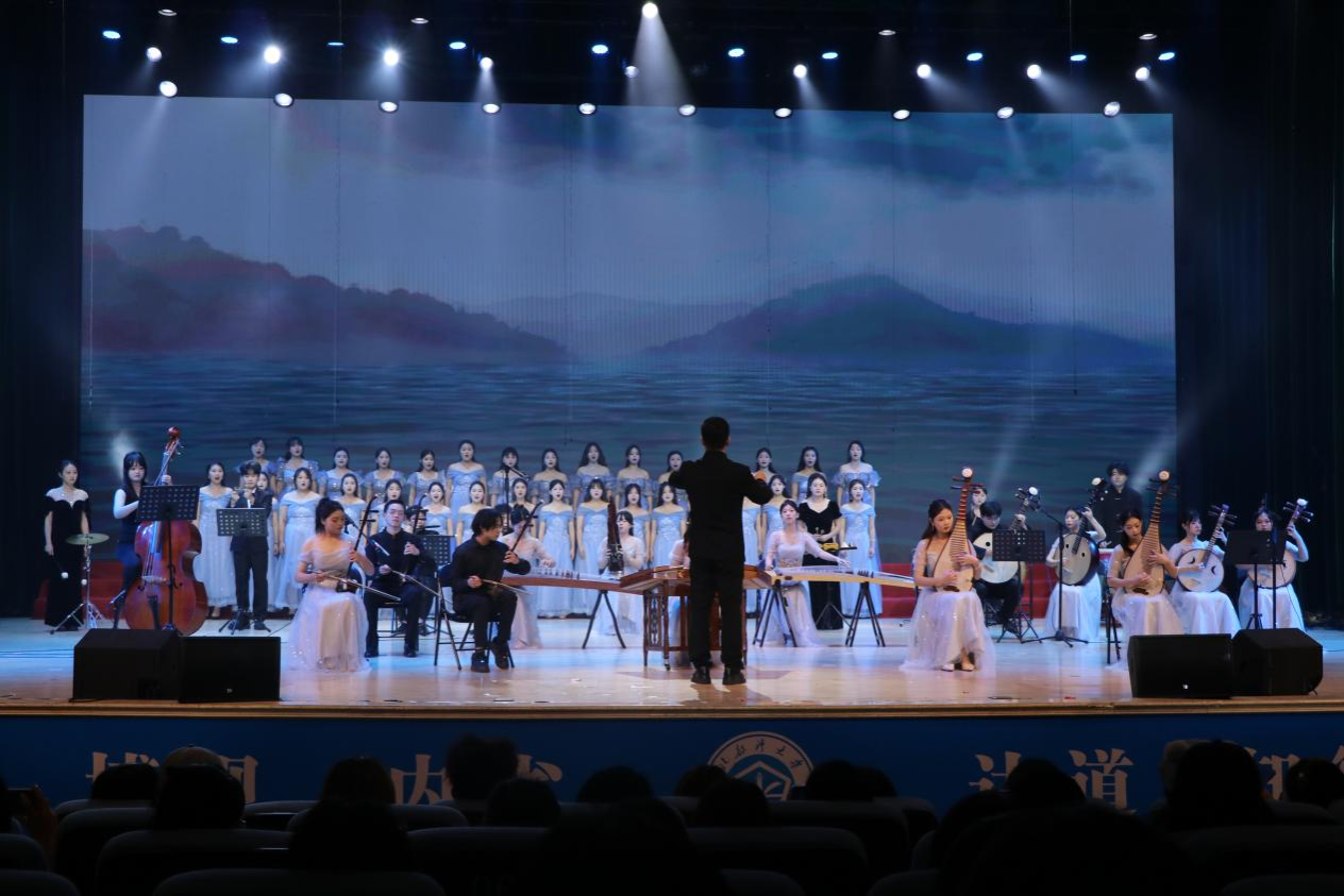 本场演出分为“源自溪流·初心如磐”“帆影书香·桃李成荫”“通江达海·故土情深”“向海图强·潮头放歌”四个篇章。在欢快的开场曲《欢腾的节日》中汇演拉开帷幕。第一篇章中,合唱《小河淌水》《鸳鸯・饮江》勾勒山水意境,舞蹈《黔・行》展现地域风情,粤剧《荔枝颂》彰显非遗魅力。第二篇章通过舞蹈《游园》、钢琴独奏《浏阳河》及小组唱《挑着好日子山过山》,传递师生情谊与成长感悟。第三篇章以民乐合奏《别》、独唱《我的深情为你守候》及舞蹈《渔光曲》抒发对故乡的深深眷恋。第四篇章则聚焦时代主题,音乐剧《守鲎》选段唤起海洋保护意识,民乐合奏《云宫迅音》展现青春创意,歌曲《蒲公英》《星辰大海》唱响毕业生对未来的展望。整场汇演生动呈现了2026届毕业生从入学初萌到学成启航的成长历程,展现了音乐舞蹈学院的育人成效和办学成果,在全场齐唱校歌中圆满落幕。