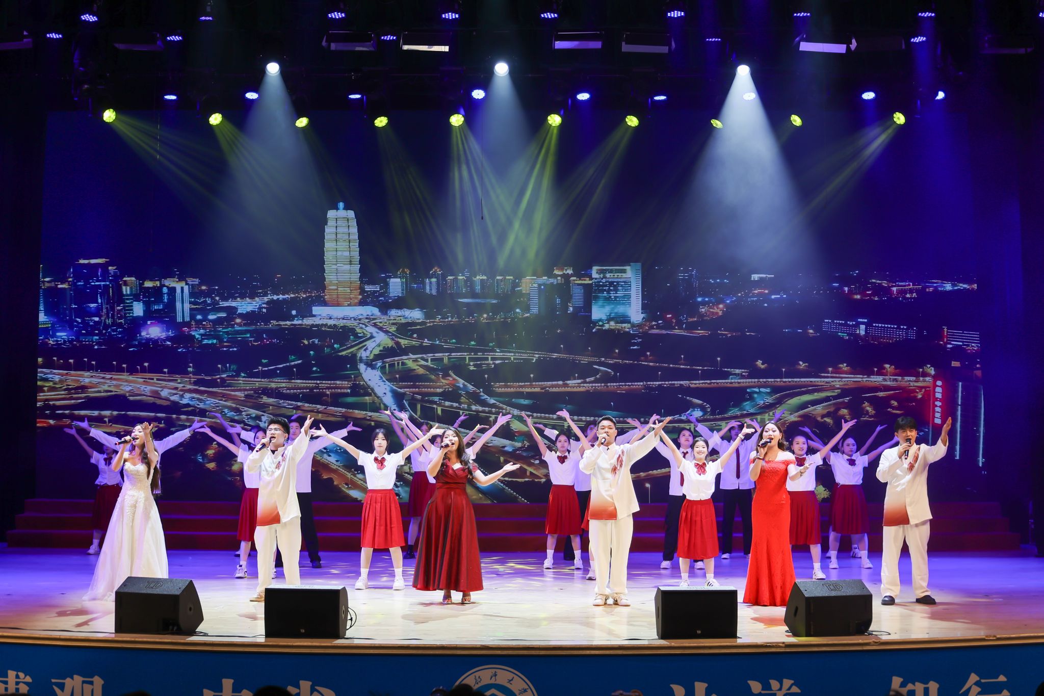 旗语操《青春奔赴》昂扬开启“旭日映运河·钦向新纪元”篇章,整齐有力的动作,展现青春奔赴新征程的豪情。小品《万松书院》以幽默方式演绎求学故事,传递严谨治学、师生情深的真谛。歌舞《相亲相爱》温暖热烈,凝聚起湾大人同心前行的深厚情谊。合唱歌舞《通江达海启新航》将盛典推向高潮,激昂的歌声与奔放的舞姿,讲述着学校服务区域经济社会高质量发展的奔赴与梦想,激励着学校师生乘平陆运河之势,在新时代的浪潮中同心同行、奋勇向前。