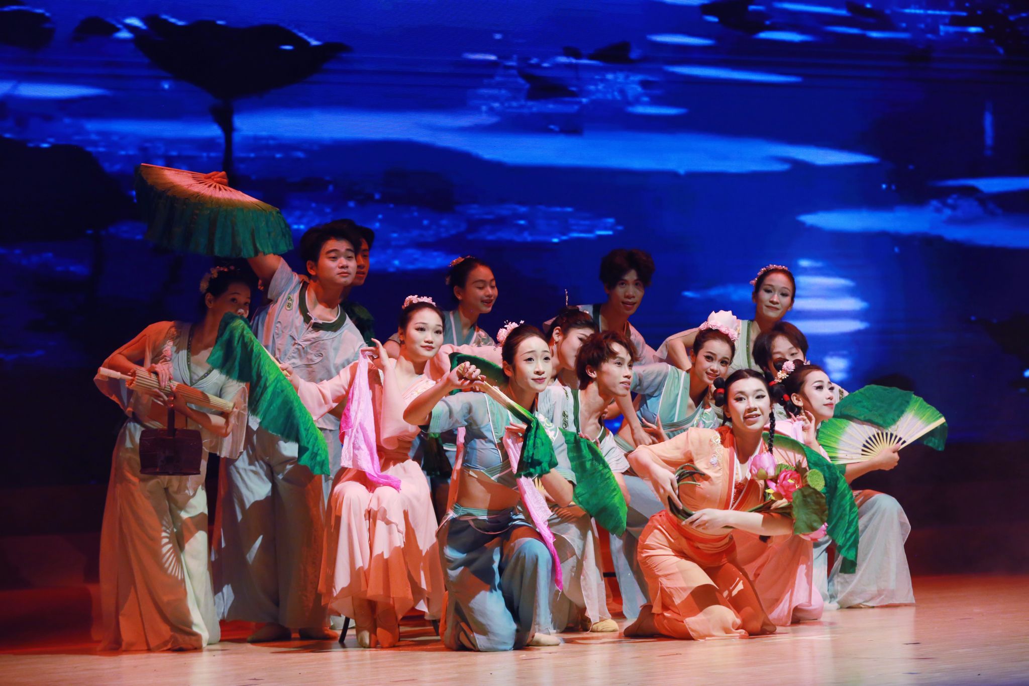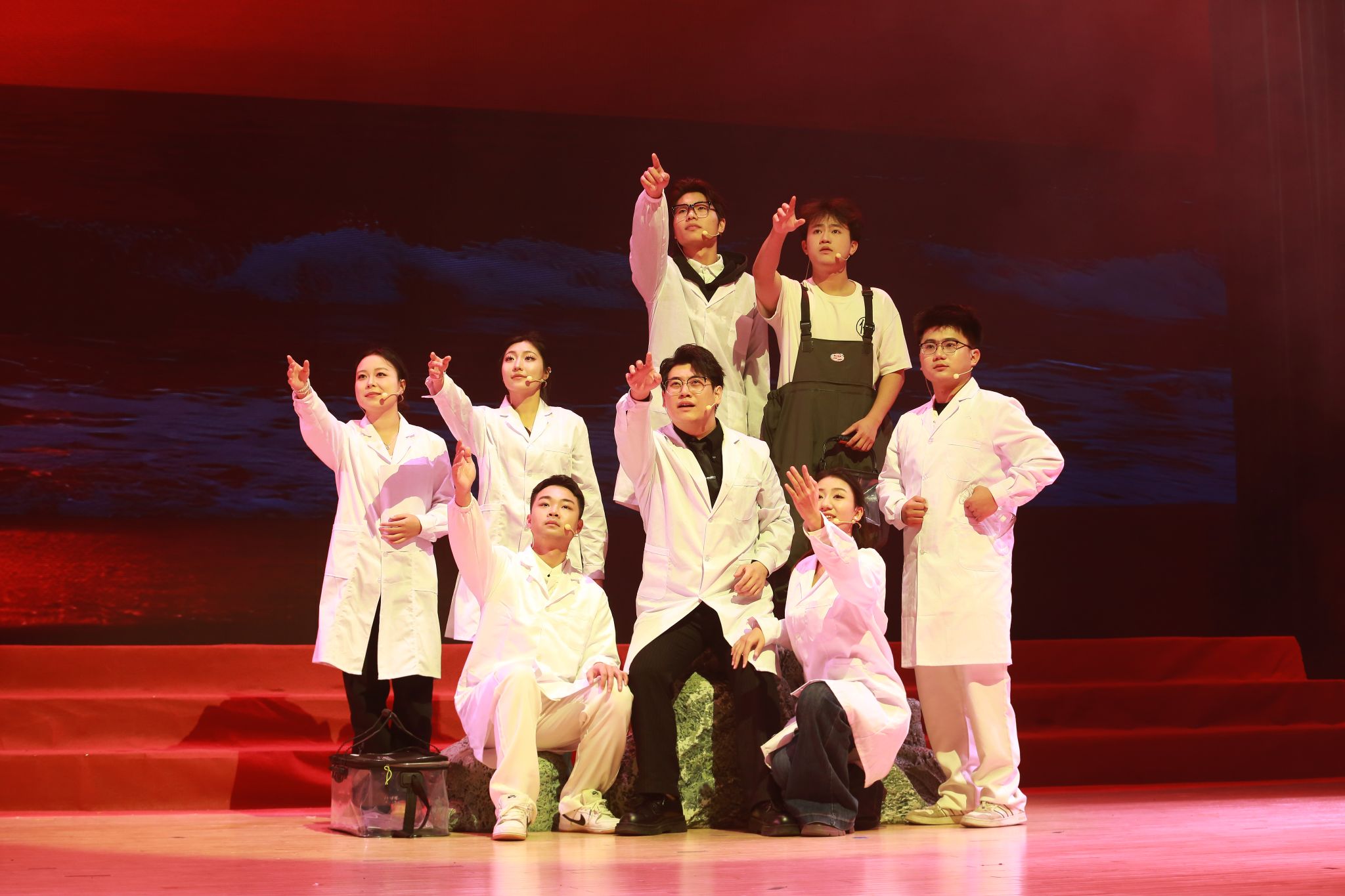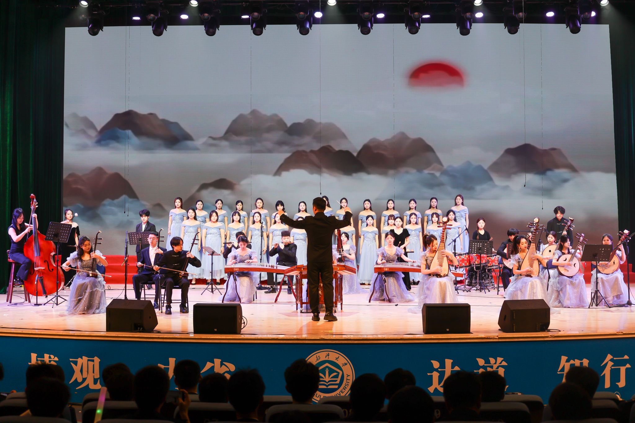 盛典紧扣时代主题与学校办学特色,在气势恢宏的民乐合奏《云宫迅音》中正式拉开帷幕。深情的朗诵《向海之路——我们的大运河》展现了学校服务向海经济发展和平陆运河建设的使命担当,开启“潮涌运河畔·青春启新航”篇章,舞蹈《江南》以柔美舞姿勾勒水乡韵味,将江南的诗意与生机展现得淋漓尽致。原创音乐剧《守鲎》选段《守候》致敬学校海洋科研工作者对中国鲎保护的执着坚守,诠释守护自然的深沉力量。教师舞蹈《一条大河》则以动人舞步,演绎育人初心如长河奔流、润泽心灵。
