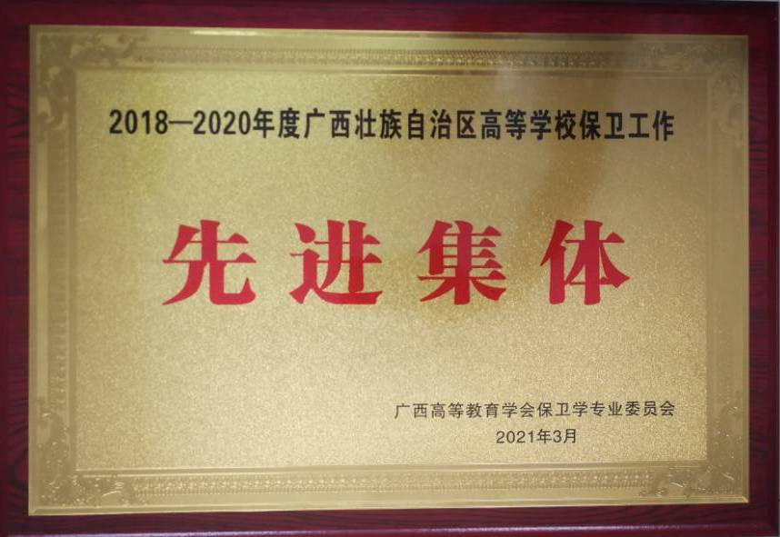 近日,从2021年广西高教保卫学会年会暨保卫学会换届大会上获悉,beat365官网武装部(保卫处)被评为“2018-2020年度广西壮族自治区高等学校保卫工作先进集体”,武装部(保卫处)部(处)长陈达兴和国防教育科科长曹荣强分别被评为“2018-2020年度广西壮族自治区高等学校保卫工作先进个人”。
