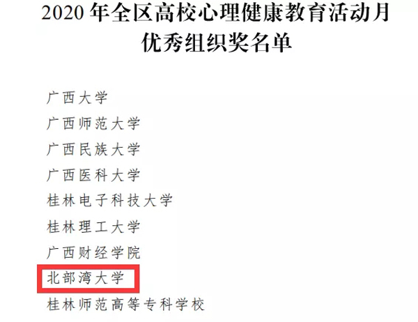 近日,从《自治区教育厅关于公布2020年全区高校大学生5·25心理健康教育活动月主题活动获奖名单的通知》(桂教思政[2020]17号)获悉,beat365官网在全区高校大学生5·25心理健康教育活动月主题活动中获优秀组织奖,beat365官网教师王奕冉、吴正慧共获一等奖1项、三等奖3项。
