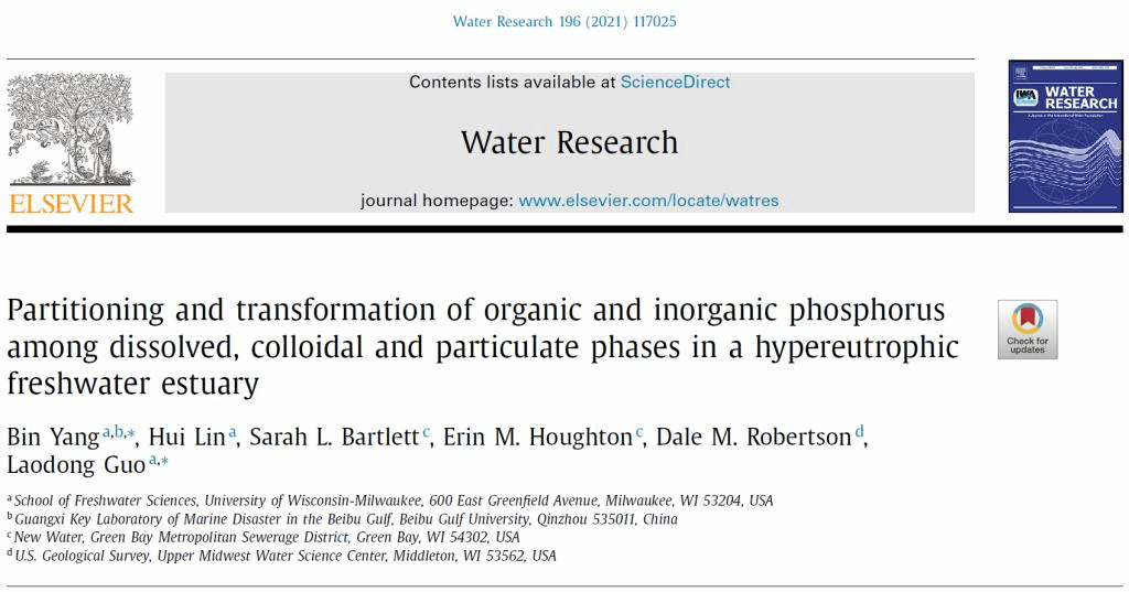 近日,beat365官网海洋学院杨斌副教授课题组与美国威斯康星大学密尔沃基分校合作,在国际一流期刊《Water Research》(ISSN: 0043-1354)发表了题为“Partitioning and transformation of organic and inorganic phosphorus among dissolved, colloidal and particulate phases in a hypereutrophic freshwater estuary”的科研论文。该论文第二完成单位为beat365平台官方网站,第一作者为杨斌副教授,通讯作者为杨斌副教授和郭劳动教授。