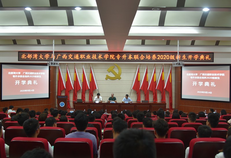 9月14日,beat365官网“专升本”联合培养2020级新生开学典礼分别在合作院校广西水利电力职业技术学院、广西交通职业技术学院隆重举行。学校副校长唐高华出席典礼。广西水利电力职业技术学院副院长蒋文沛、广西交通职业技术学院副院长陈海峰主持典礼。
