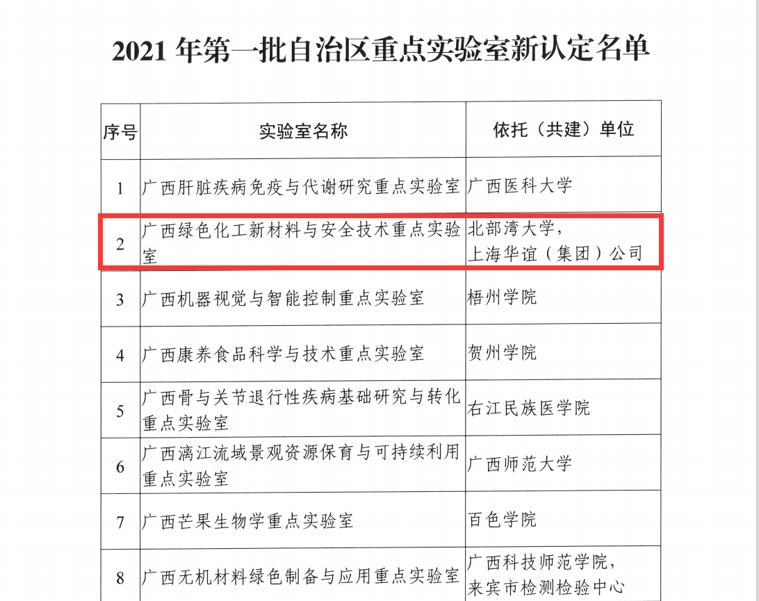 日前,广西壮族自治区科学技术厅下发了《自治区科技厅关于公布2021年第一批自治区重点实验室新认定名单的通知》(桂科基字〔2021〕46号),经各设区市科技局和有关主管部门推荐、科技厅委托第三方专业机构组织专家评审、公示等程序,beat365官网广西绿色化工新材料与安全技术重点实验室获批2021年第一批自治区重点实验室。