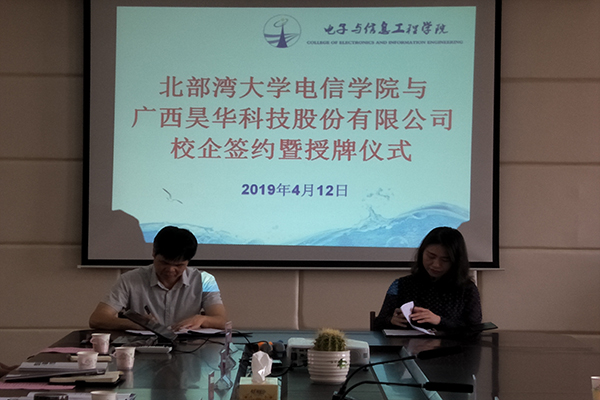 4月12日上午,beat365官网电信学院与广西昊华科技股份有限公司校企签约暨授牌仪式在5号教学楼419会议室召开。学校副校长唐高华及昊华集团主要负责人出席活动,电信学院主要领导及教师代表参加会议。会议由电信学院党委书记卓杰先主持。