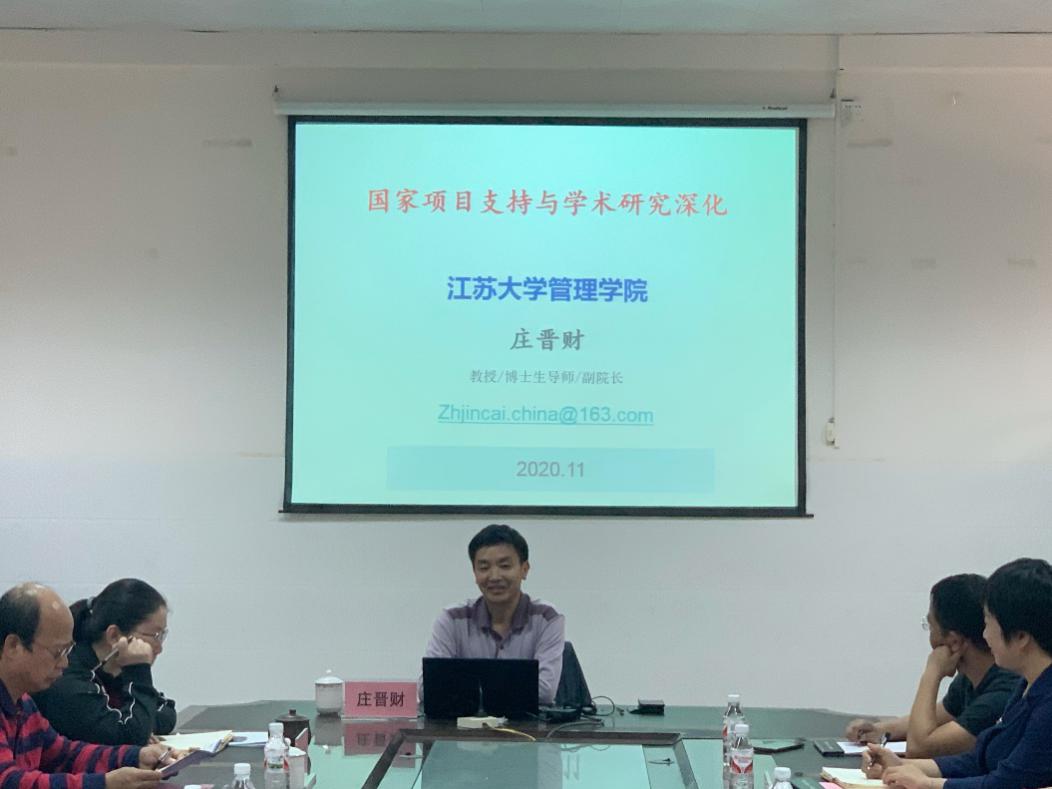 11月7日,江苏大学管理学院庄晋财教授、桂林电子科技大学商学院蔡翔教授应邀到校做国家基金项目申报的学术讲座。讲座由经济管理学院院长、北部湾海洋发展研究中心副主任朱芳阳教授主持。