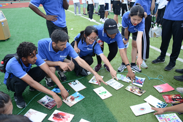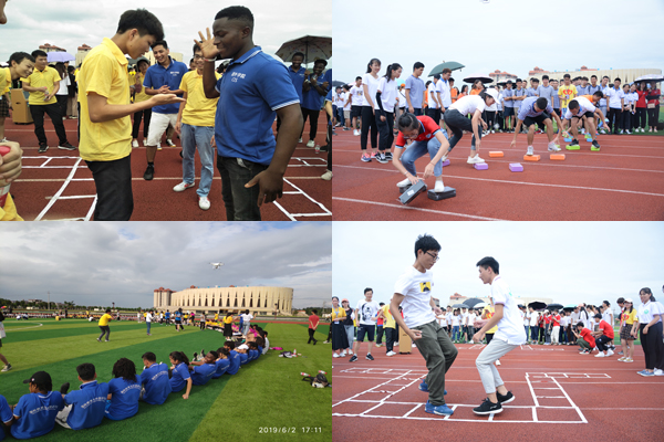 活动现场,同学们热情高涨,运动会精彩纷呈。在“扑面而来”项目中,每个同学咬着一张纸片传递面粉,由于传递时队友口中喘出的气使得面粉沾上了的同学的脸庞,惹来笑声朗朗。在“狭路相逢”项目中,每组10人进行比赛,参赛者向前逐格跳跃,相遇时通过石头剪刀布决定是退回原点还是继续向前,活动中欢声笑语盈盈,同学们的团队合作越来越默契。活动中最引人注目的要数国外院的留学生参赛队,理解游戏规则对他们而言是一项挑战,而与中国学生合作完成比赛更是不易,他们时而迷惑时而恍然大悟击掌称快,时而蓄势待发时而热情欢呼,成为全场亮点。
