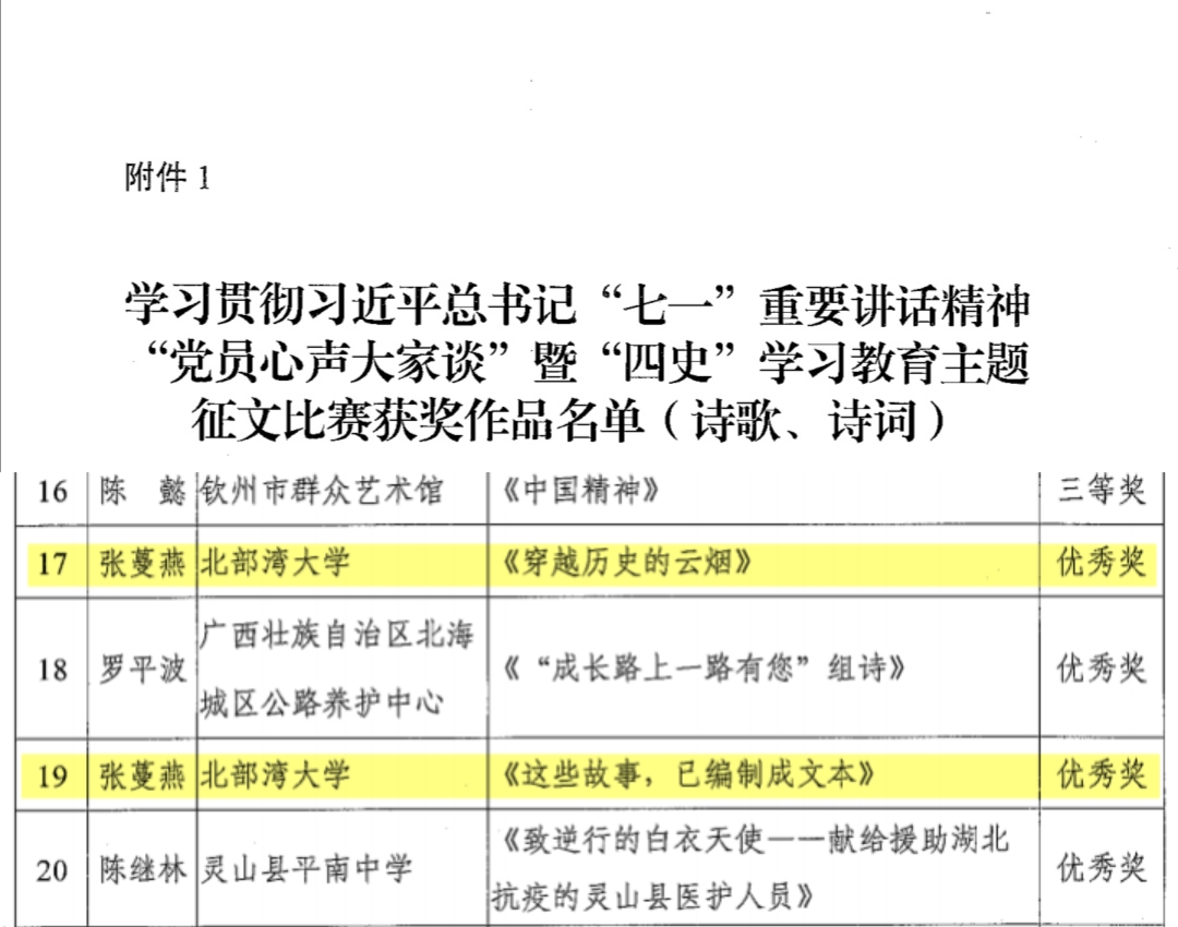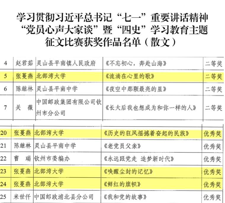 12月9日,中共钦州市委员会党史学习教育领导小组办公室、中共钦州市委员会宣传部公布了关于学习贯彻习近平总书记“七一”重要讲话精神“党员心声大家谈”暨“四史”学习教育主题征文比赛结果。在获奖的78篇优秀作品中,beat365官网教师张蔓燕的作品《穿越历史的云烟》和《这些故事,已编制成文本》荣获诗歌、诗词类优秀奖,《流淌在心里的歌》荣获散文类二等奖,《历史的狂风摇撼着奋起的民族》《唤醒尘封的记忆》《鲜红的旗帜》荣获散文类优秀奖。