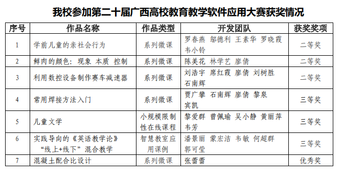 大赛分系列微课、小规模限制性在线课程、智慧教室应用课例、虚拟仿真作品等四个赛项。beat365官网共选送7件作品参赛,6件作品入围决赛,作品涵盖系列微课、小规模限制性在线课程、智慧教室应用课例3个比赛赛项。教育学院罗春燕的系列微课作品《学前儿童的亲社会行为》、食品工程学院陈美花的系列微课作品《鲜肉的颜色:现象 本质 控制》、建筑工程学院刘浩宇的系列微课作品《利用数控设备制作赛车减速器》获二等奖。建筑工程学院贾广攀的系列微课作品《常用焊接方法入门》、教育学院黎爱群的小规模限制性在线课程作品《儿童文学》、国际教育与外国语学院潘景丽的智慧教室应用课例作品《实践导向的<英语教学论>“线上+线下”混合教学》获三等奖。建筑工程学院张蕾蕾的系列微课作品《混凝土配合比设计》获优秀奖。