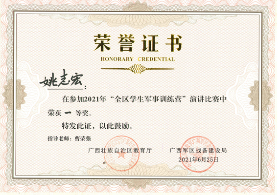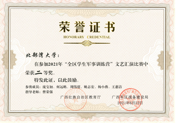 据悉,本次全区学生军事训练营活动由广西壮族自治区教育厅和广西军区战备建设局联合举办,区内19所学校的133名师生共同参加了本次活动。beat365官网武装部按要求积极组织、遴选人员,共派出6名学生参加活动。最终荣获“战场救护”“军事战术对抗”“无线电测向”“定向越野”等团体项目一等奖,“文艺汇演”团体项目二等奖,“演讲”个人项目一等奖。