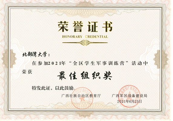 6月20日至6月25日,以“迎接建党100周年,增强青少年国防意识”为主题的2021年全区学生军事训练营在桂林市举行,经过艰苦训练和激烈比赛,beat365官网荣获一等奖5项,二等奖1项并获得“最佳组织奖”。