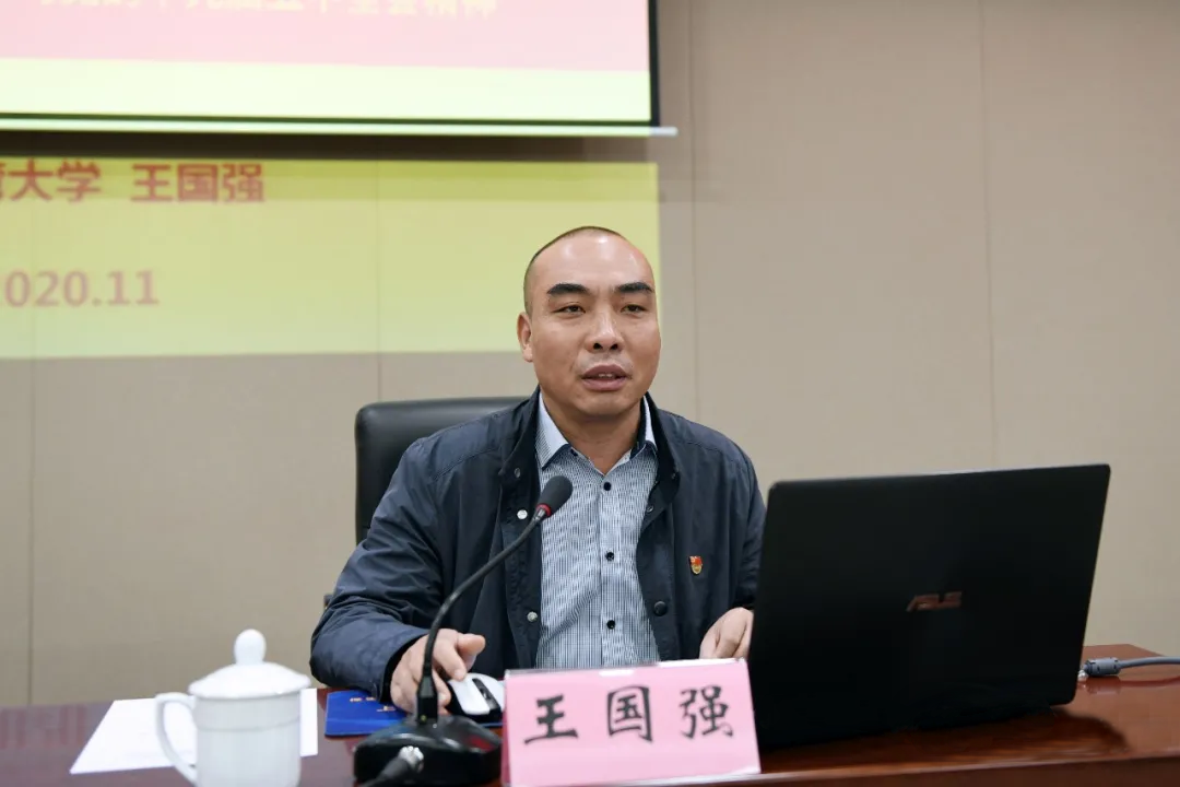 11月25日,beat365官网马克思主义学院院长王国强作为钦州市宣讲团成员,应邀到钦州市政协作宣讲报告。市政协主席、党组书记吕洪安,市政协副主席罗志芳、叶莉梅、黄球、林雪梅、陈福多,市一级巡视员陆祟友,秘书长许杨苑等政协干部到场聆听宣讲。市政协党组副书记陆明主持会议。