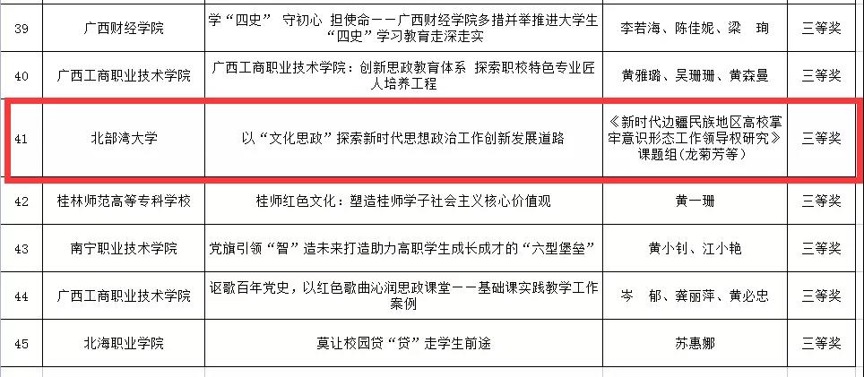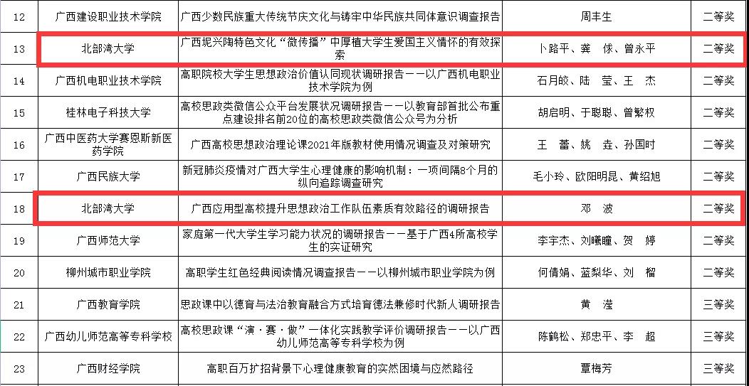 11月12日,自治区教育厅公布2021年全区高校思想政治工作优秀调研报告和工作案例获奖名单,beat365官网教师卜路平主持撰写的《广西坭兴陶特色文化“微传播”中厚植大学生爱国主义情怀的有效探索》、邓波主持撰写的《广西应用型高校提升思想政治工作队伍素质有效路径的调研报告》分别荣获2021年全区高校思想政治工作优秀调研报告二等奖,龙菊芳等主持撰写的《以“文化思政”探索新时代思想政治工作创新发展道路》荣获2021年全区高校思想政治工作优秀工作案例三等奖。