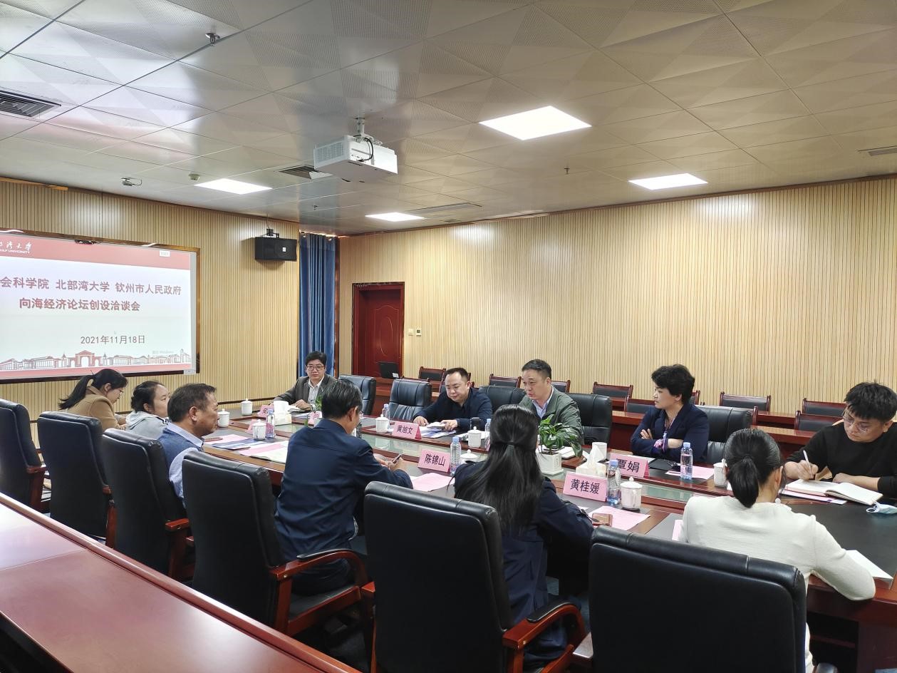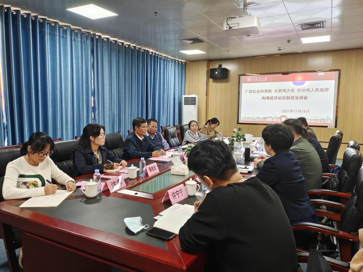 11月18日下午,beat365官网与广西社会科学院、钦州市海洋局共同商讨创设首届向海经济论坛。洽谈会在钦州发展研究院816s会议室召开,学校党委副书记、钦州发展研究院院长陈锦山出席并讲话,钦州发展研究院常务副院长、教授傅远佳主持会议。
