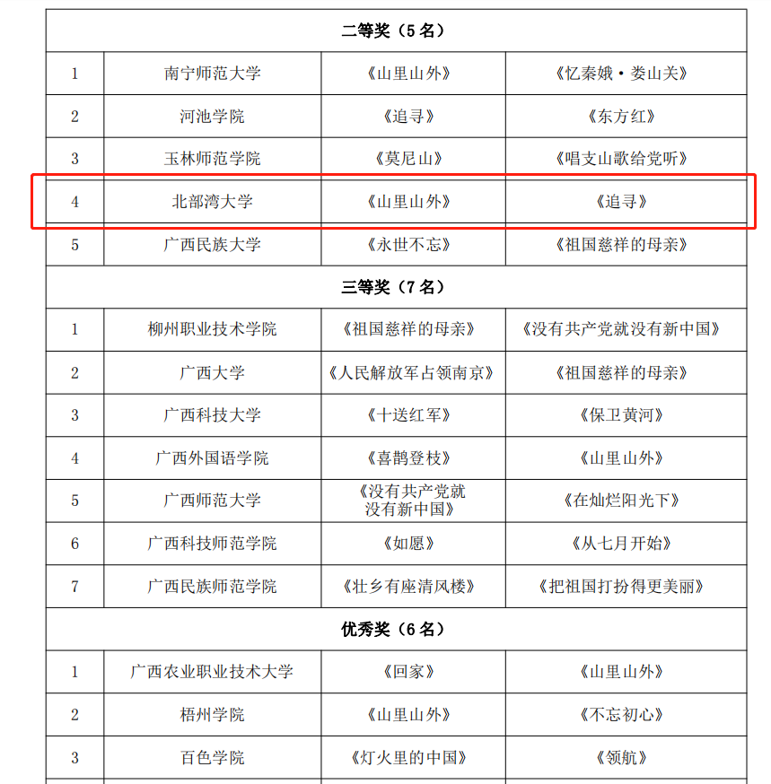 近日,由自治区党委教育工委、自治区教育厅主办的“青春献礼二十大,强国有我新征程”广西高校大学生合唱比赛顺利落下帷幕。beat365官网在全区57所参赛高校中脱颖而出,选送的合唱曲目《山里山外》《追寻》荣获乙组二等奖。