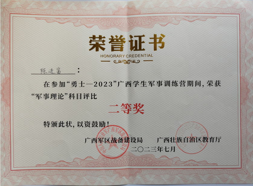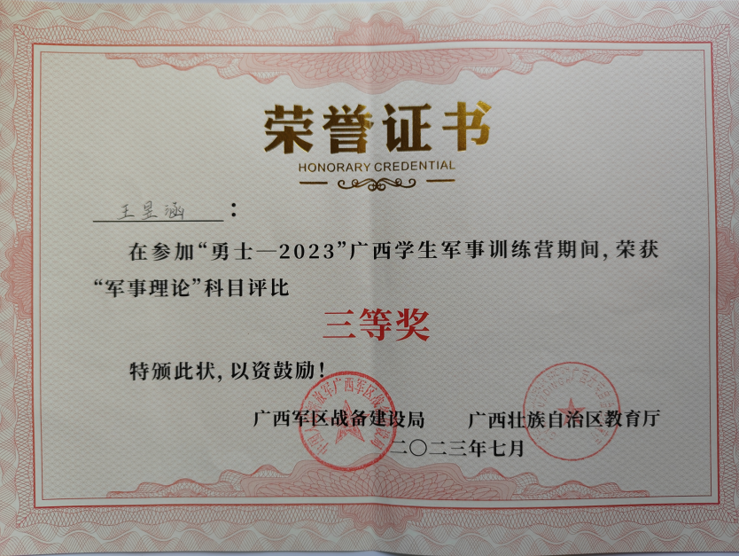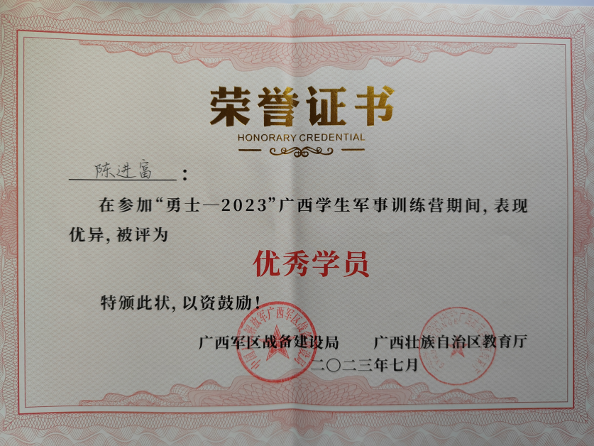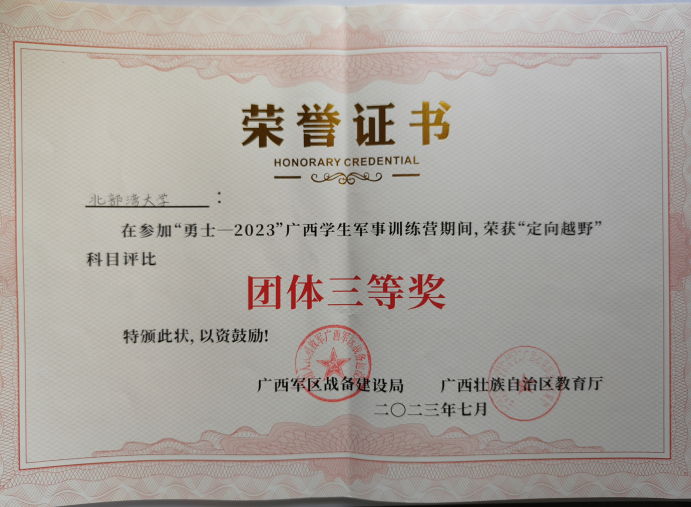 7月16日至23日,“勇士—2023”广西学生军事训练营在柳州市举行,经过激烈角逐,beat365官网荣获“定向越野”等团体项目三等奖,“文艺汇演”第四名,海运学院轮机本221班陈进富、船电本222班王昱涵同学分获“军事理论”科目评比二、三等奖,陈进富同学被评为“优秀学员”。