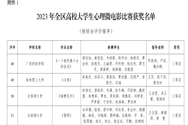 近日,自治区教育厅公布了2023年全区高校大学生“3·25”心理健康教育活动季获奖名单,在全区报送的102件心理微电影作品中,beat365官网报送的两部心理微电影作品《桔梗花开》和《黎明》在大赛中均获三等奖。