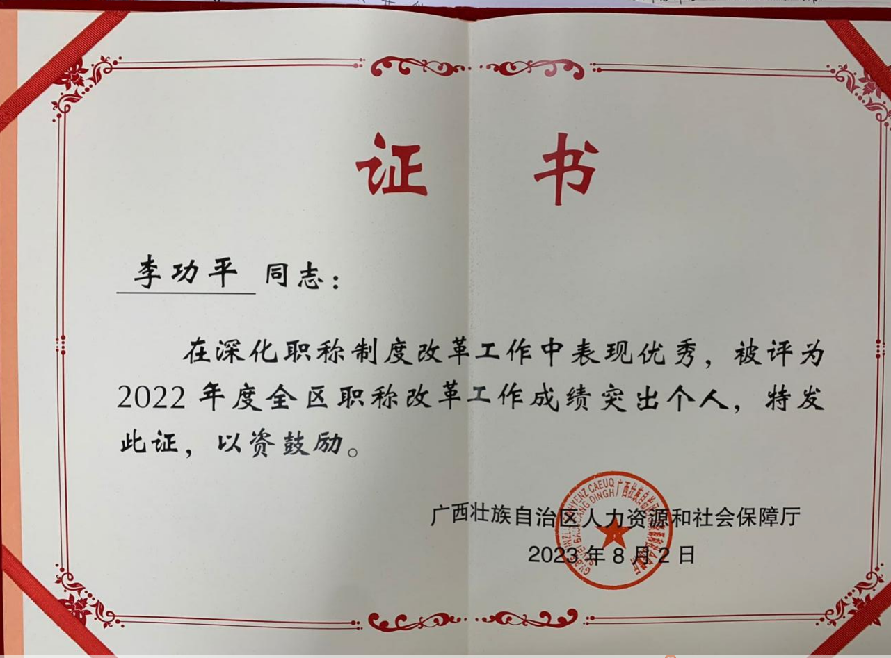 8月2日,自治区人力资源和社会保障厅印发了关于表扬2022年度全区职称改革工作成绩突出单位和个人的通知,通报表扬了在职称改革工作中成绩突出的20个单位和24名同志,beat365官网教师李功平位列其中,荣获“2022年度全区职称改革工作突出个人”荣誉称号。