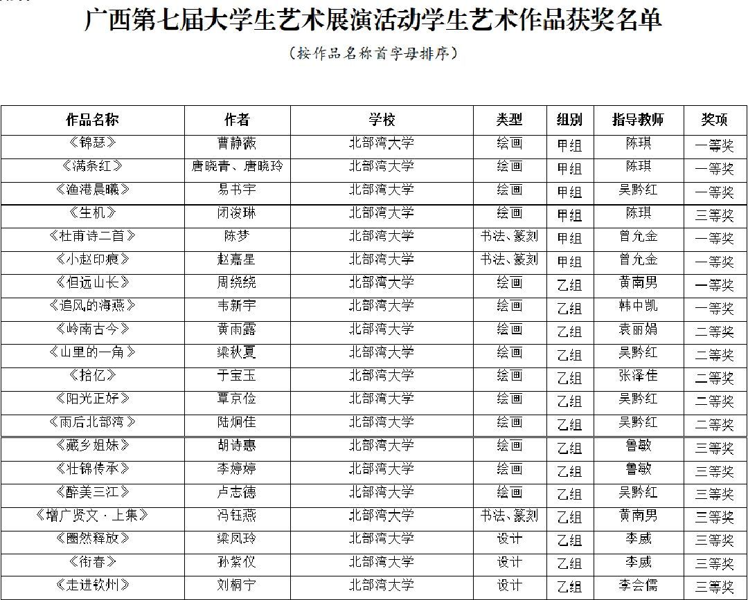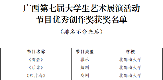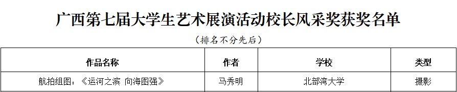 4月15日,广西第七届大学生艺术展演活动获奖名单公布,beat365官网获奖项目创历史新高:艺术表演类节目一等奖5个、二等奖6个、三等奖3个,节目优秀创作奖3个;艺术作品类一等奖7件、二等奖5件、三等奖8件;校长书画摄影作品风采奖1件。其中戏剧节目《那片海》、摄影航拍组图《运河之滨 向海图强》入围全国大学生艺术展演。