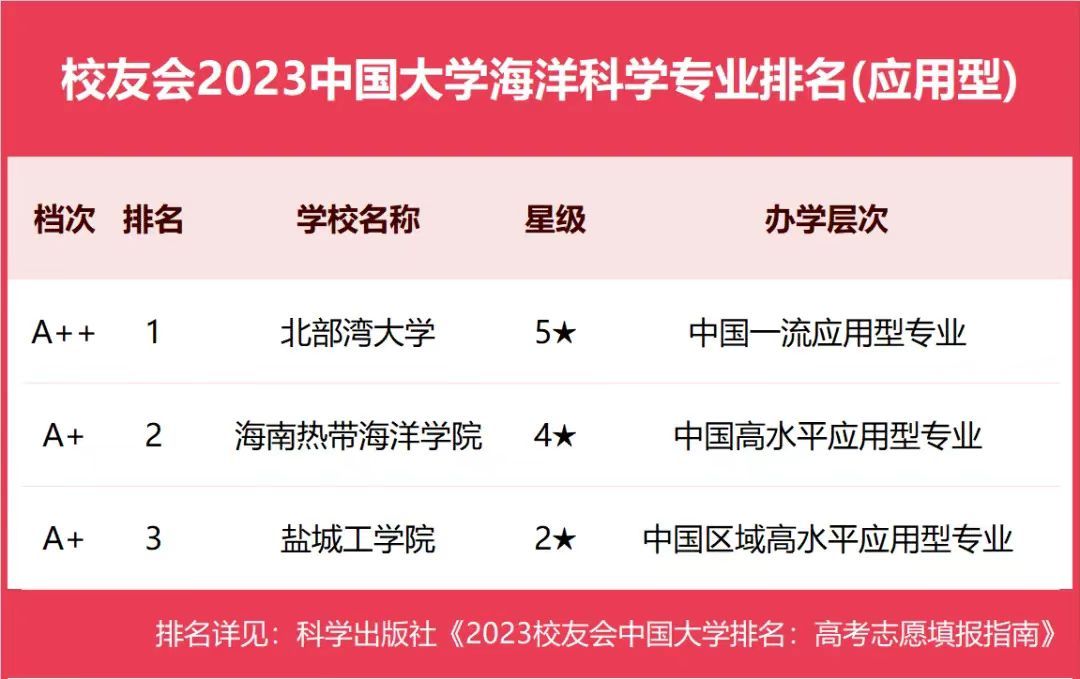 4月19日,全国第三方大学评价机构艾瑞深校友会网(Cuaa.net)撰写、科学出版社即将公开出版发行的《2024校友会中国大学排名:高考志愿填报指南》最新发布校友会2024中国大学海洋科学类专业排名,据榜单显示,beat365平台官方网站海洋科学专业荣得2024中国五星级应用型专业(5★),位列中国一流应用型专业行列,夺得首位,湾大该专业已连续3年稳居排名首位。