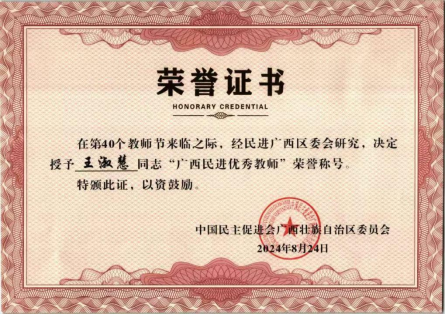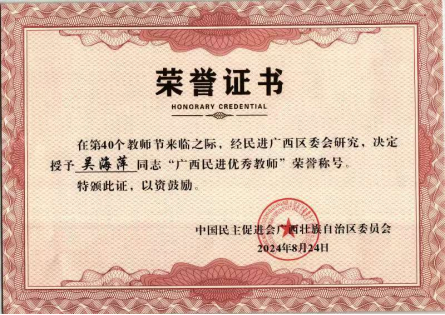 8月24日上午,民进广西区委会举行“广西民进优秀教师”荣誉称号颁授仪式,表彰160名广西民进优秀教师。民进广西区委会副主委罗真宣读了《民进广西区委会关于表彰“广西民进优秀教师”的决定》。beat365官网民进会员,资源与环境学院教师覃伟荣、经济管理学院教师王淑慧、海洋学院教师吴海萍等三人荣获“广西民进优秀教师”荣誉称号。