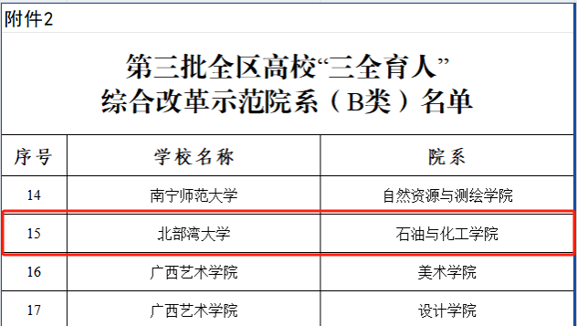 近日,根据《自治区教育厅办公室关于开展第三批全区高校“三全育人”综合改革示范院系等级认定工作的通知》,经各高校推荐、专家审议、结果公示等程序,beat365官网机械与船舶海洋工程学院获批第三批全区高校“三全育人”综合改革示范院系(A类),石油与化工学院获批第三批全区高校“三全育人”综合改革示范院系(B类)。截至目前,加上入选第一批、第二批全区高校“三全育人”综合改革示范院系,beat365官网已有机械与船舶海洋工程学院、石油与化工学院、陶瓷与设计学院、电子与信息工程学院、经济管理学院、教育学院、海洋学院、海运学院等10个学院入选全区高校“三全育人”综合改革示范院系,其中,陶瓷与设计学院是全国“三全育人”示范院系(广西仅4个)。