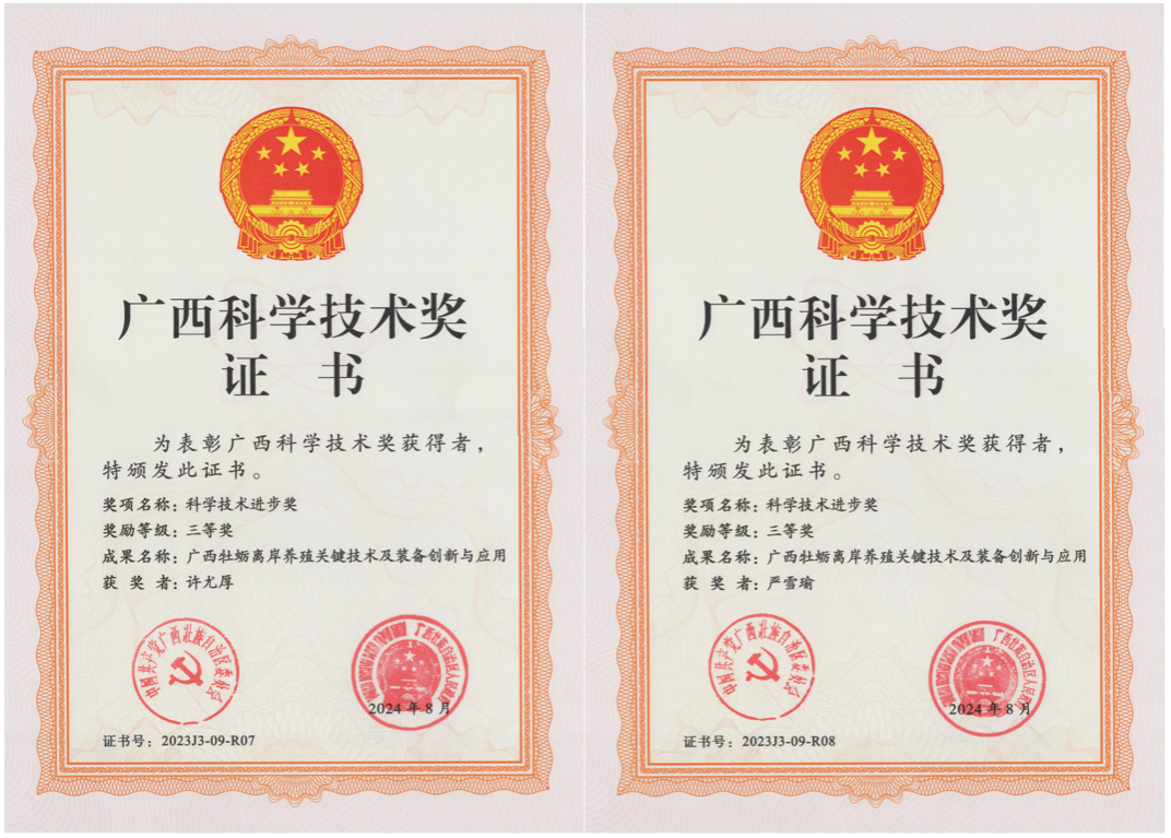 2023年度广西科学技术进步奖三等奖 | 广西牡蛎离岸养殖关键技术及装备创新与应用 | 彭金霞、张兴志、韦嫔媛、何苹萍、徐文其、官俊良、许尤厚、严雪瑜、张立、罗帮 |