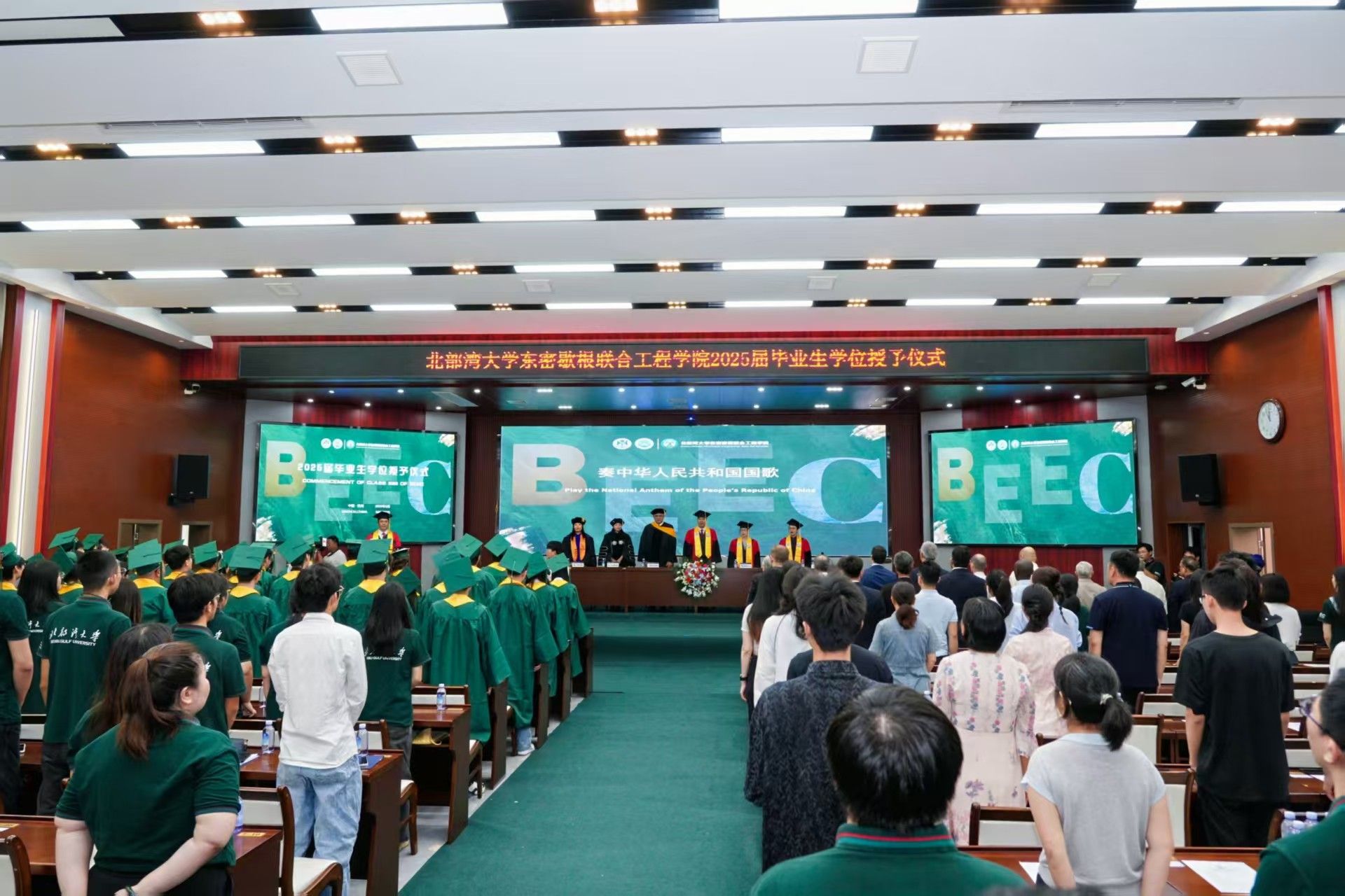 在庄重的学位授予环节,毕业生代表依次登上主席台。唐高华与Qatu博士共同为学子拨穗正冠,并赠送刻有院训的毕业纪念礼物。这份承载着两校教育基因的礼物,既是对跨文化学习经历的纪念,更寄托着对毕业生成为“全球工程领域沟通者”的期许。毕业生们将带着师长的嘱托与时代的使命,正式踏上以创新连接世界的新征程。