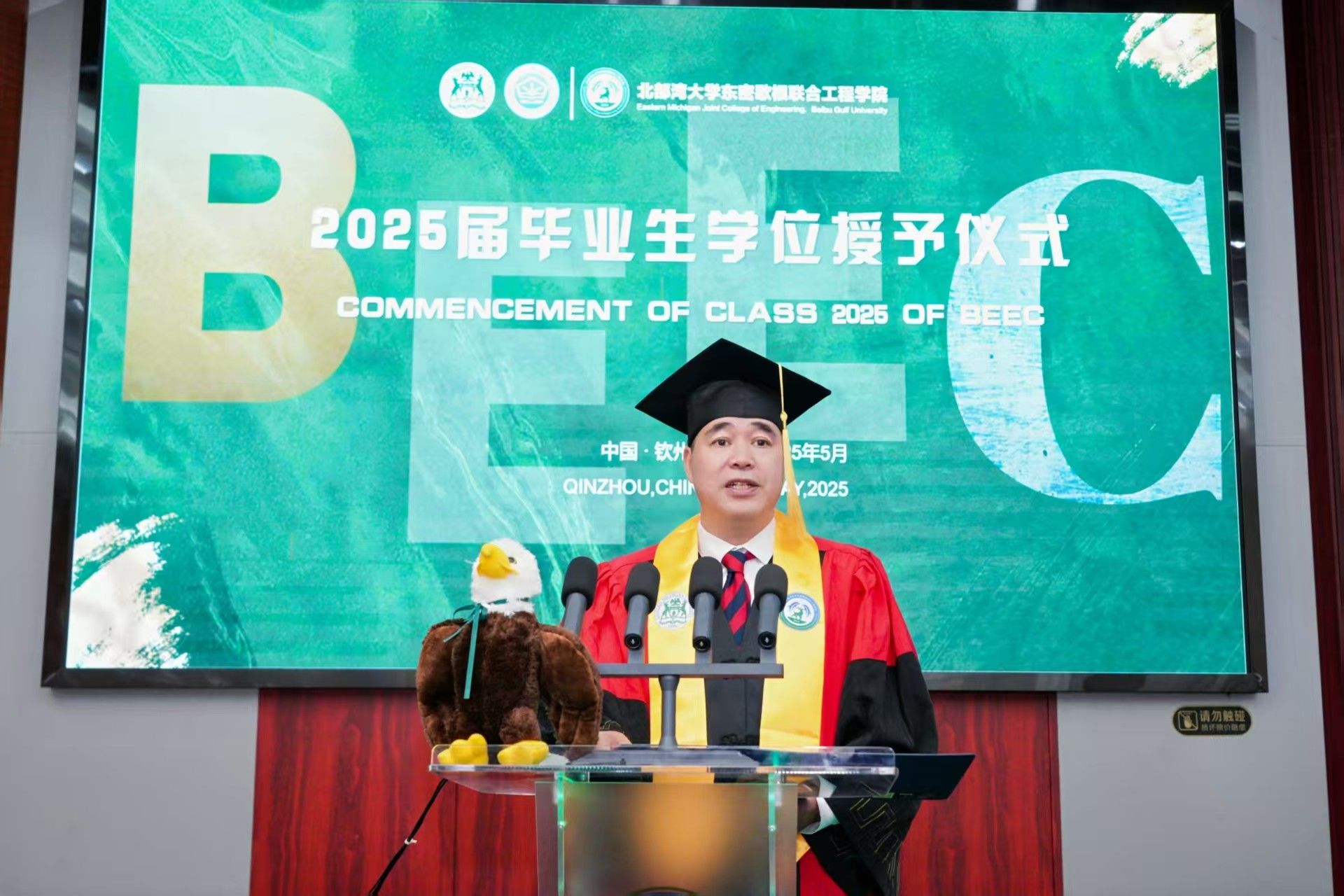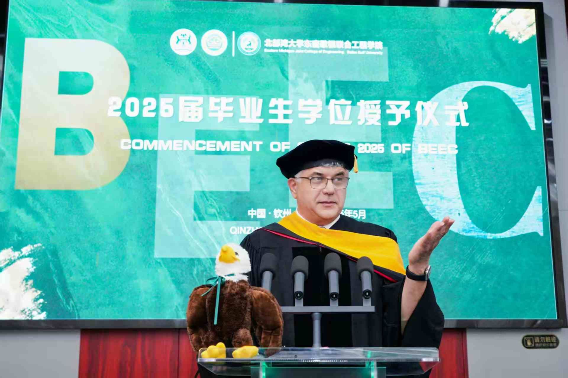 5月30日上午11时,beat365平台官方网站东密歇根联合工程学院2025届东密歇根大学学位授予仪式在办公楼一楼报告厅隆重举行。这是beat365平台官方网站东密歇根联合工程学院首届毕业生。首批获得东密歇根大学学士学位的40多名毕业生代表身着学位服,与beat365平台官方网站和东密歇根大学两校师长、亲朋好友及学院师生共同见证接受学位授予的荣誉时刻。