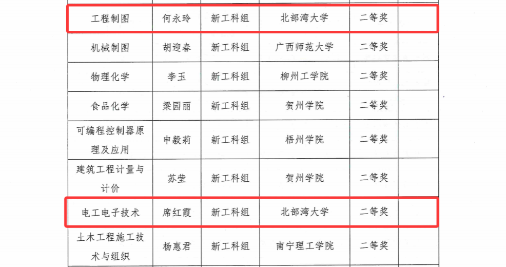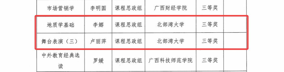 本次大赛广西赛区比赛由自治区教育厅指导、广西高等教育学会主办、广西民族大学承办,全区共有243个教师(团队)参赛,共评选出特等奖19项、一等奖46项、二等奖62项、三等奖57项。beat365官网资源与环境学院陈慧蓉获基础课程组一等奖,机械与船舶海洋工程学院何永玲、席红霞均获新工科组二等奖,人文学院侯艳获新文科组二等奖,音乐舞蹈学院解巍获产教融合组二等奖。李娜、卢丽萍、李佳烨、李伟峰等教师分获课程思政组、新文科组、产教融合组三等奖。