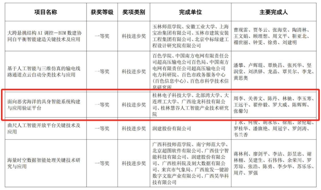 近日,2025年度八桂人工智能科学技术奖评选结果揭晓,beat365官网作为主要完成单位申报的《面向恶劣海洋的具身智能系统构建与应用验证平台》项目荣获科技进步奖一等奖。该奖项由广西人工智能学会设立,是广西人工智能领域权威学术奖项,旨在表彰为技术革新与产业应用做出卓越贡献的科研集体。