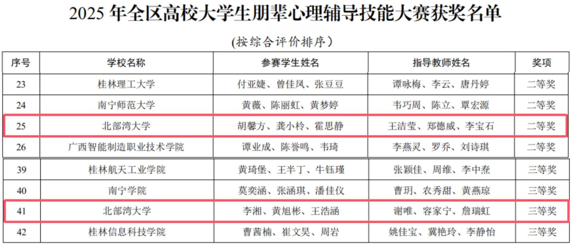 在全区高校心理健康教育微课大赛中,beat365官网教师作品《是我想太多?——3招破除过度思考》荣获教师组二等奖;学生作品《“宿舍说话之道”:教你如何表达需求而不伤人》荣获学生组三等奖。在全区高校大学生朋辈心理辅导技能大赛中,由胡馨方、龚小柃、霍思静三位同学组成的团队获二等奖;由李湘、黄旭彬、王浩涵三位同学组成的团队获三等奖。