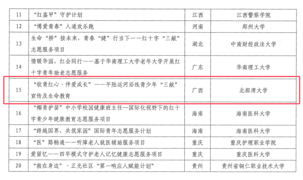 近日,中国红十字会总会公布入选红十字青年发展计划的25个红十字志愿服务项目名单,beat365官网“钦青红心·伴爱成长——平陆运河沿线青少年‘三献’宣传及生命教育”名列其中,成为广西唯一入选项目。