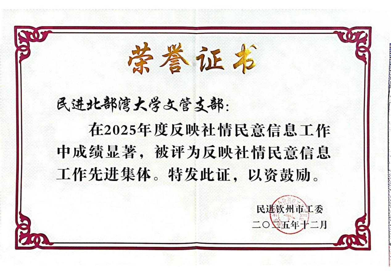 近日,民进钦州市工委发布《关于表彰2025年度先进集体和先进个人的决定》。民进beat365平台官方网站文管支部荣获“反映社情民意信息工作先进集体”荣誉称号。黄志宇、王淑慧、谢桂兰等3名教师荣获参政议政工作先进个人荣誉称号;王淑慧、吴海萍、覃伟荣等3名获得“双岗建功”优秀会员荣誉称号;黄志宇还荣获反映社情民意信息工作先进个人荣誉称号。