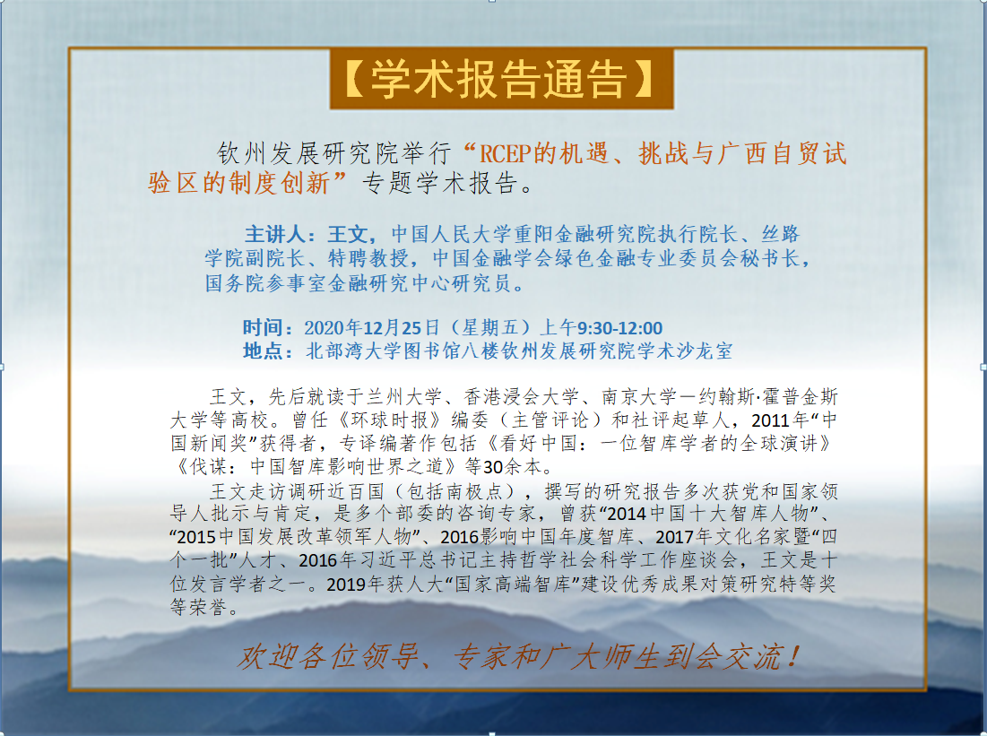 钦州发展研究院于2020年12月25日(星期五)上午举行“RCEP的机遇、挑战与广西自贸试验区的制度创新”报告,特邀请中国人民大学重阳金融研究院执行院长、国务院参事室金融研究中心研究员王文作专题学术报告。