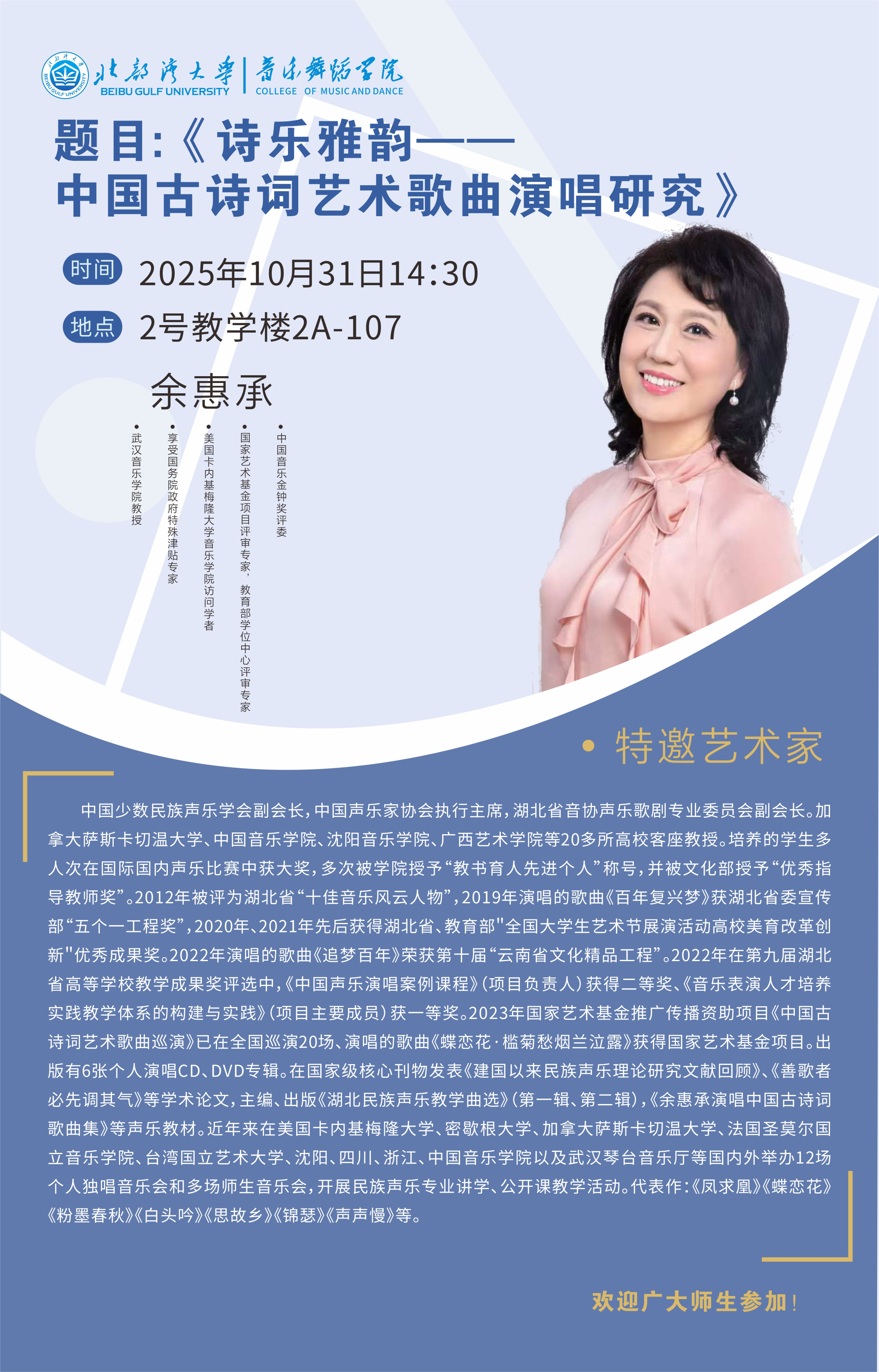 报告题目:《诗乐雅韵---中国古诗词艺术歌曲演唱研究》