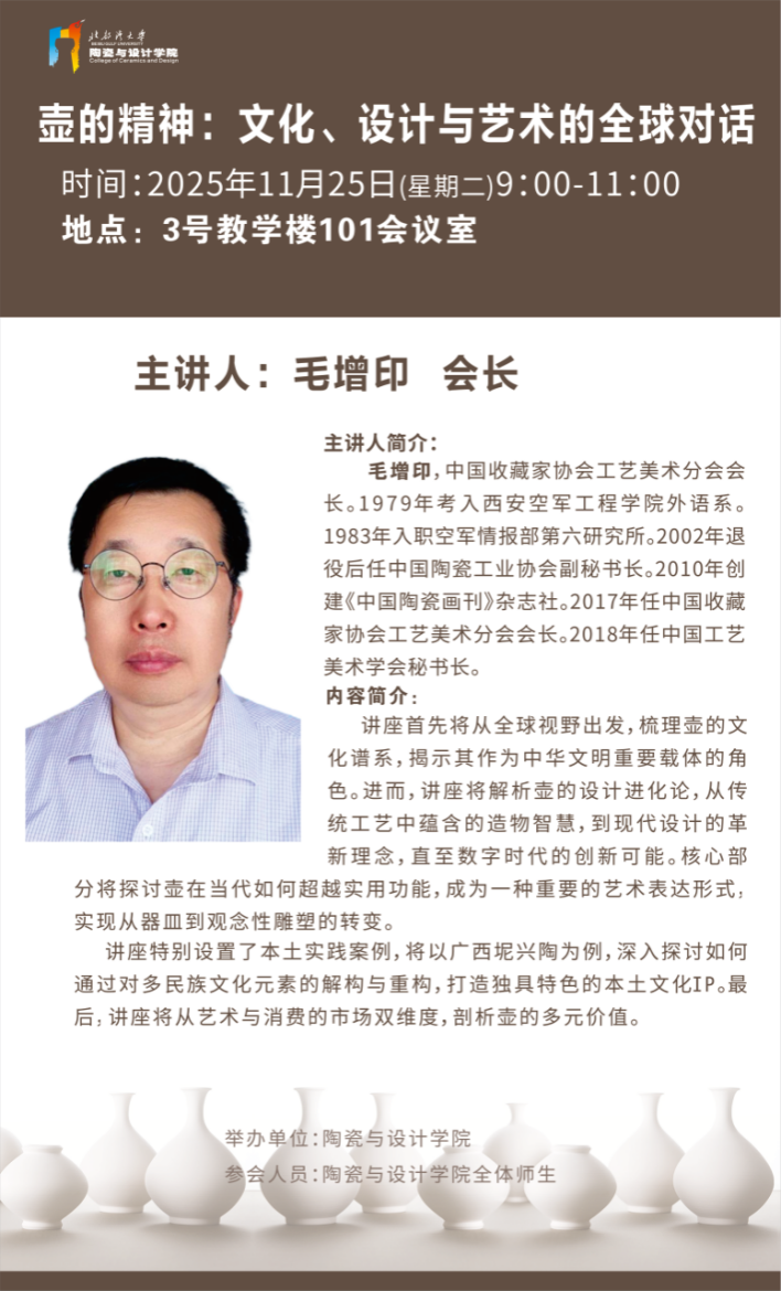 讲座首先将从全球视野出发,梳理壶的文化谱系,揭示其作为中华文明重要载体的角色。进而,讲座将解析壶的设计进化论,从传统工艺中蕴含的造物智慧,到现代设计的革新理念,直至数字时代的创新可能。核心部分将探讨壶在当代如何超越实用功能,成为一种重要的艺术表达形式;实现从器皿到观念性雕塑的转变。