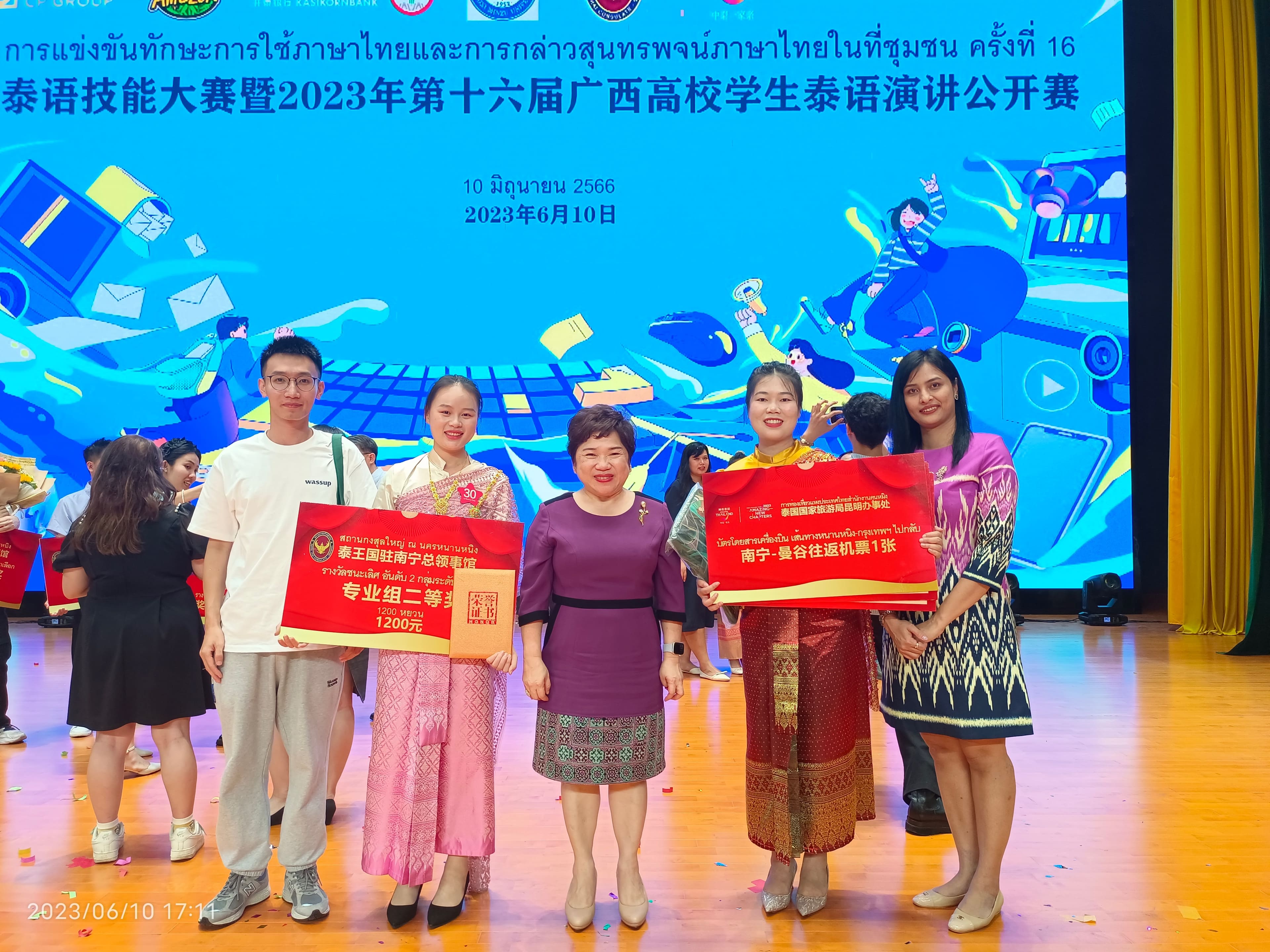 6月10日,由泰王国驻南宁总领事馆与广西民族大学联合主办的泰语技能大赛暨2023年第十六届广西高校学生泰语演讲公开赛在南宁举行。本次比赛共有广西区内19所高校的30名选手参加专业组比赛,18支参赛队伍参加非专业组比赛。beat365官网泰语专业在本次大赛中喜获佳绩,刷新了beat365官网泰语本科专业创办以来参加该赛事的最佳成绩。