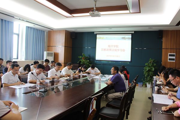 6月28日下午,海洋学院在7A-229会议室召开宗教政策法规学习会,集中学习了《习近平总书记关于宗教工作重要论述》及宗教工作相关知识。参加学习会的有海洋学院院长许尤厚、党委副书记黄玉果、杨斌副院长以及学院全体教职工。党委书记杜书营主持会议。