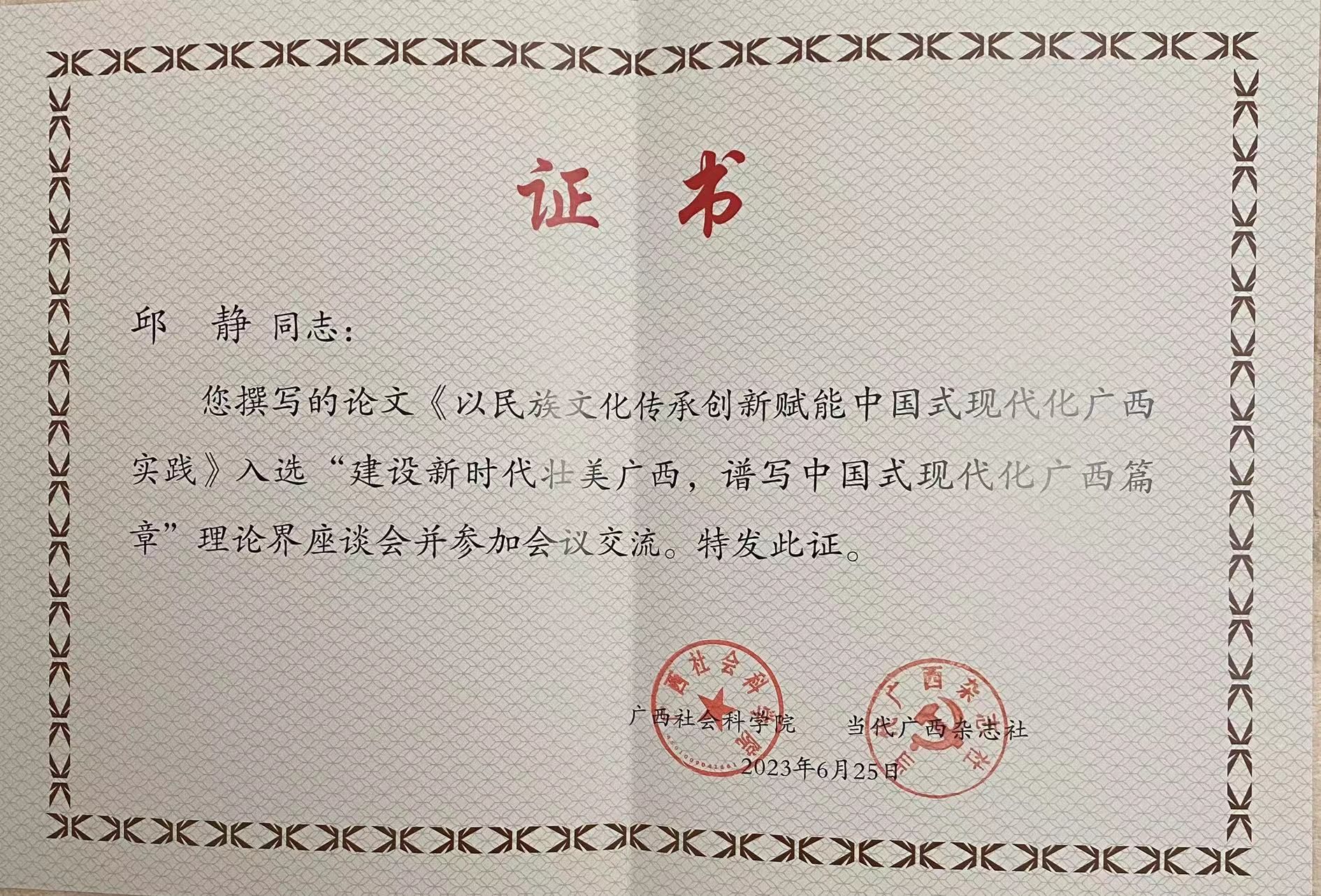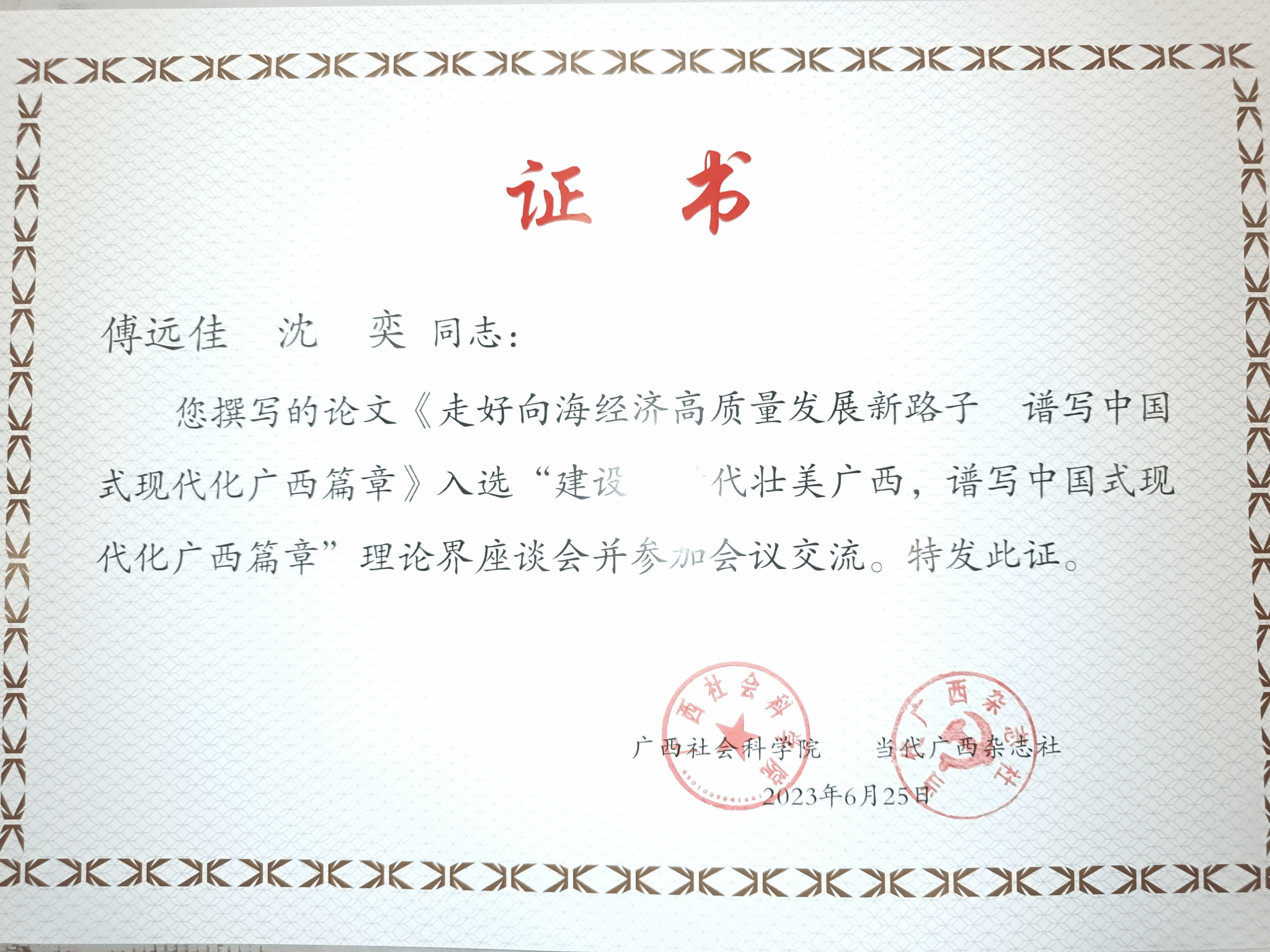 傅远佳、沈奕撰写的论文《走好向海经济高质量发展新路子,谱写中国式现代化广西篇章》和邱静撰写的《以民族文化传承创新赋能中国式现代化广西实践》获入选论文并作书面交流。