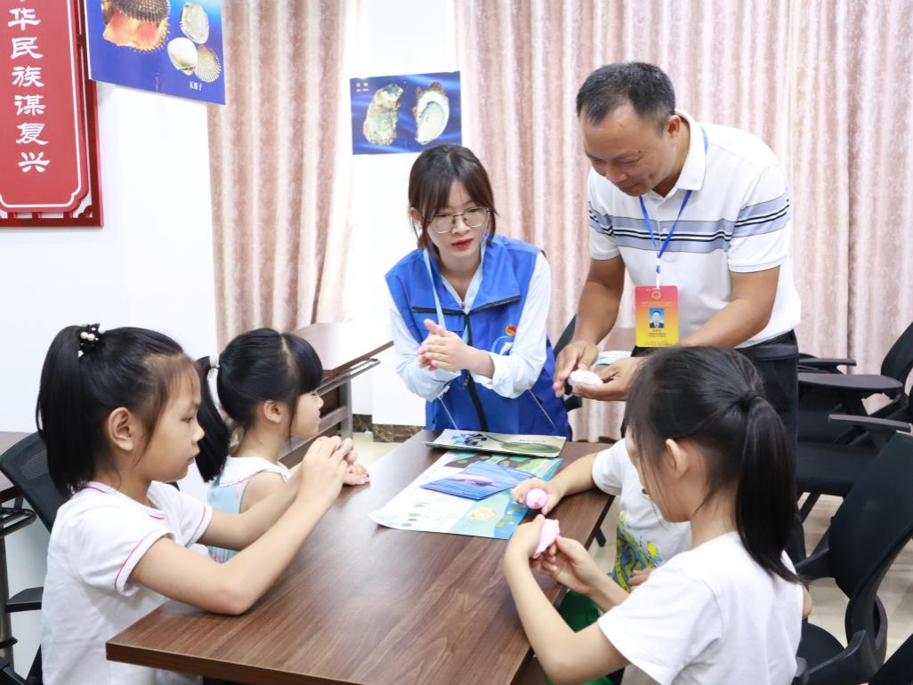 服务团成员给易地扶贫安置小区的小朋友科普海洋生物
