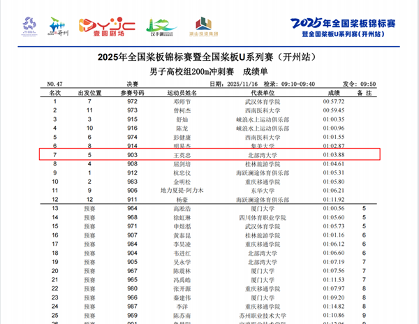 领队唐明欢表示,张瑛的双冠成绩和浆板队整体实力的提升,是学校体育育人成果的体现。学校重视和支持海洋运动项目发展,体育学院(国际海洋运动学院)通过完善训练设施、优化课程设置、强化学业保障,为学生运动员创造良好条件,提供坚实平台。近年来我们大力推进“海洋体育+”特色项目建设,将桨板、皮划艇等水上运动融入人才培养体系,积极推动体教融合,加强应用型人才培养。未来,我们将持续深化体育教学改革、注重实践能力培养,以赛促练、以练促学,助力更多学子在全国赛事中取得优异成绩,为学校进一步打造国际海洋运动特色品牌注入强劲动力,培养更多高素质体育应用型人才。
